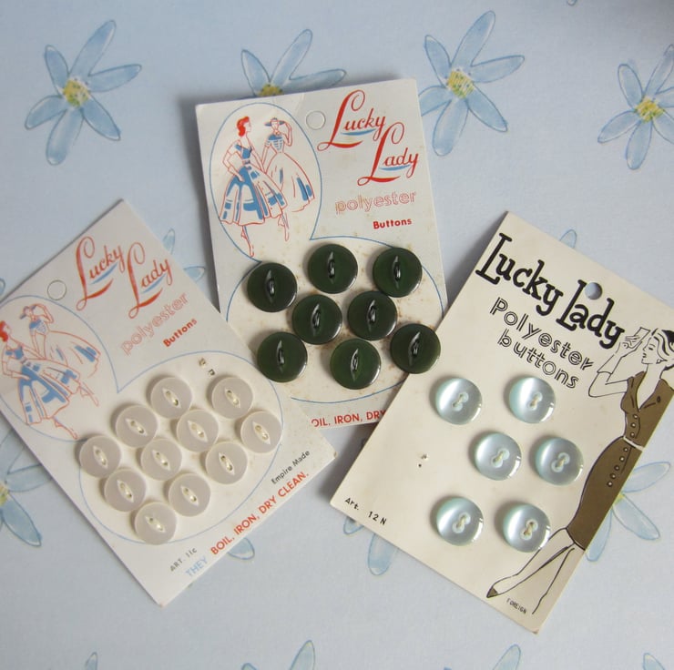 3 cards of vintage buttons. 25 buttons in all (1 missing from 2 of the cards). The green buttons are the largest at 14 mm wide. Each card measure 95 x 63 mm approx.