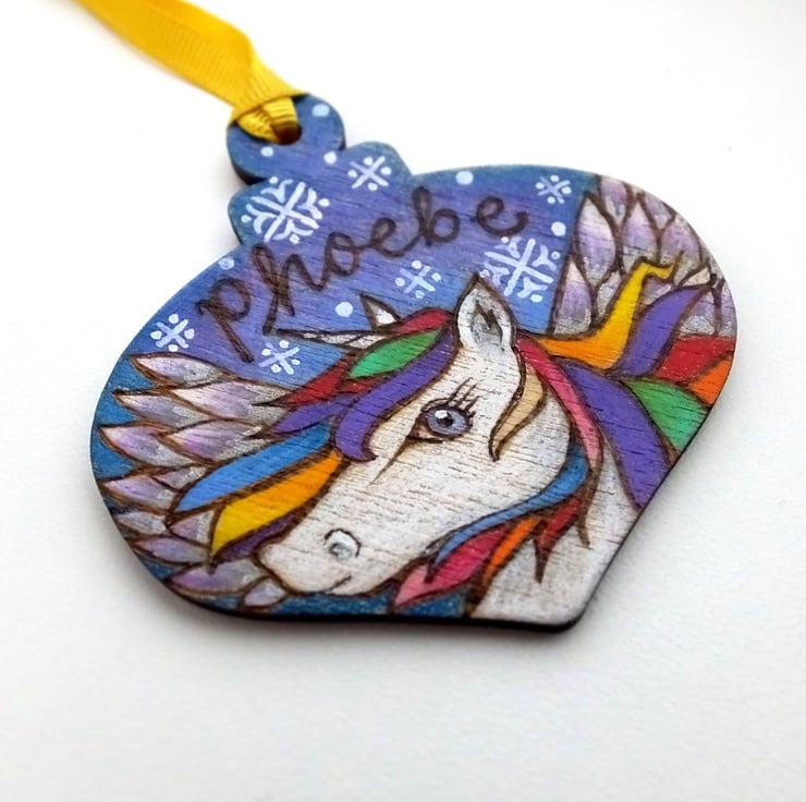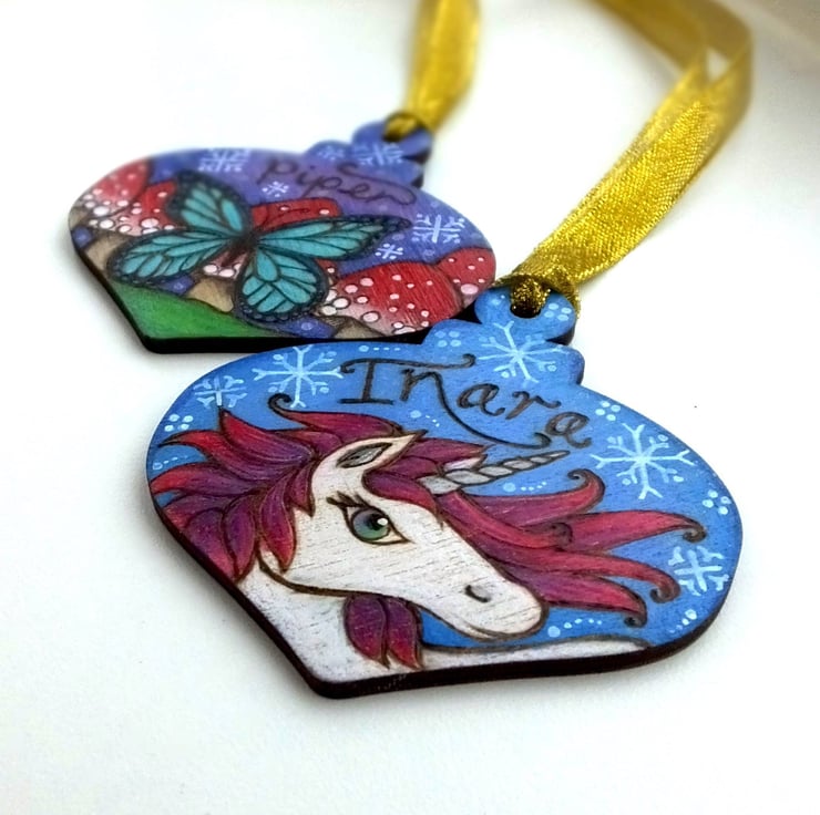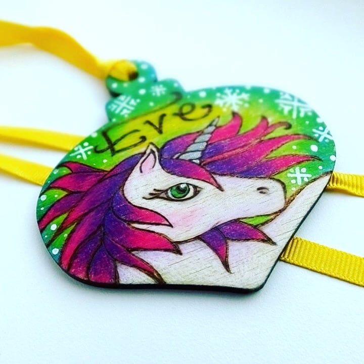 This listing is for a unicorn flat wooden Christmas / Yule bauble. They are made to order, with a name of your choice, and a short message, date or further name to a coloured reverse.