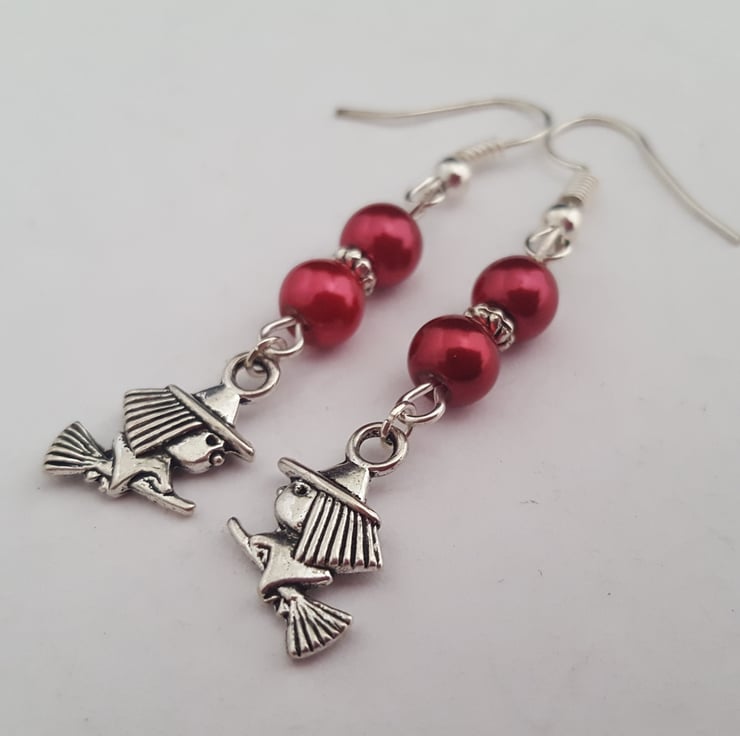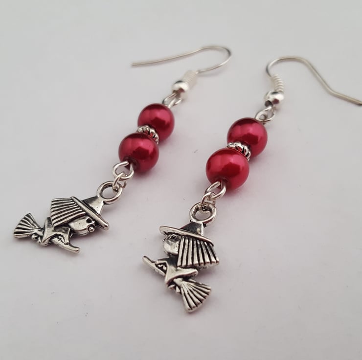6mm red glass pearls and double sided Tibetan silver witches on broomsticks. 35mm long excluding the hypo allergenic silver plated hooks. In an organza gift bag.