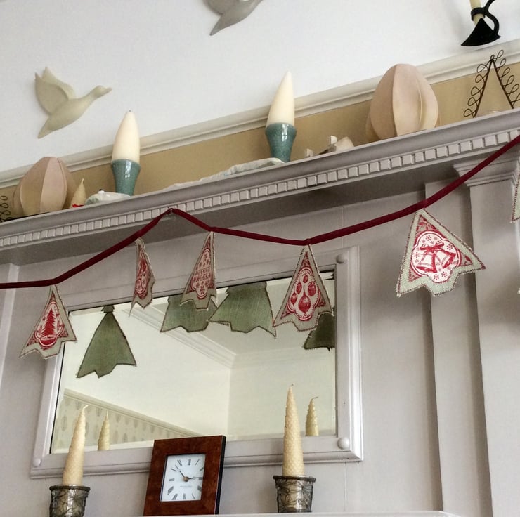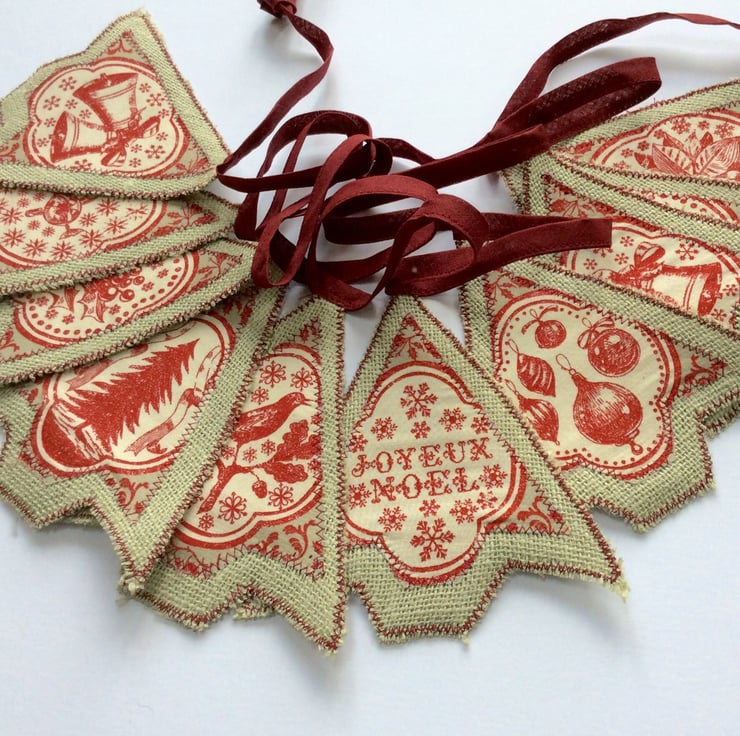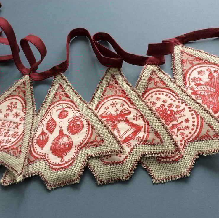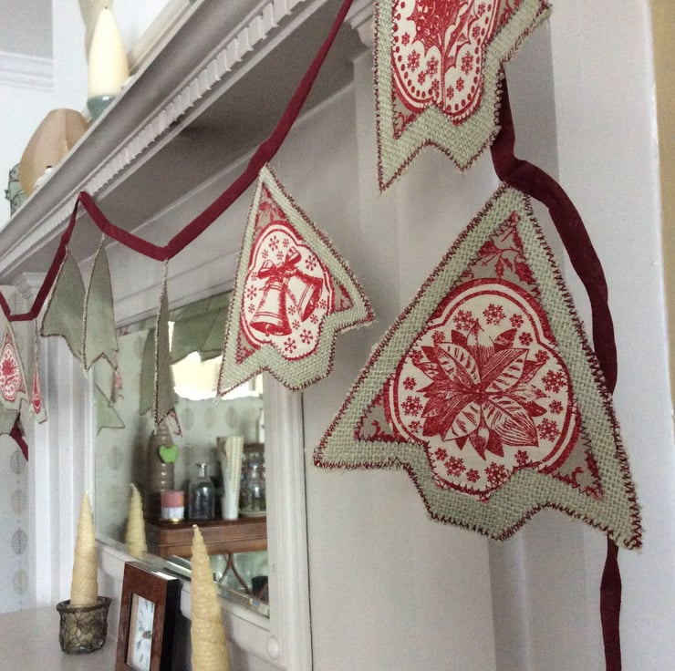 The bunting is made up of ten Christmas tree shaped pennants which have been strung on a claret red ribbon which has a generous hanging tie at each end.