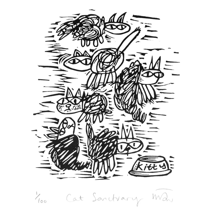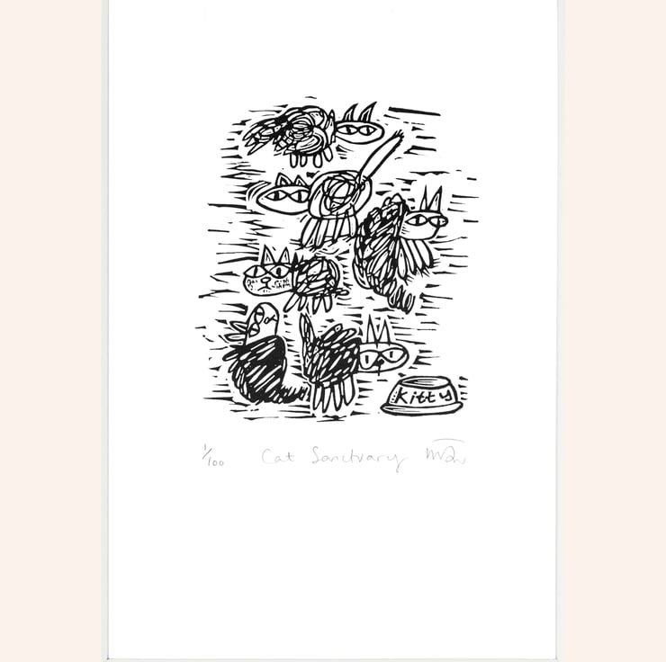 The listing is for an unframed lino print and it will arrive wrapped in cellophane and backed with card ready to give as a gift or to frame up. It would make a great gift for a cat loving friend....