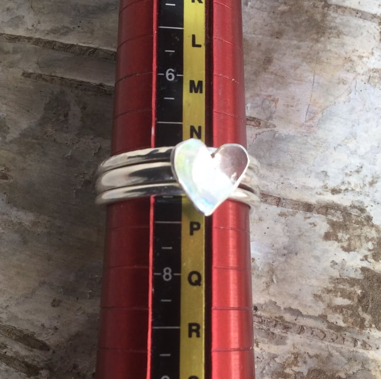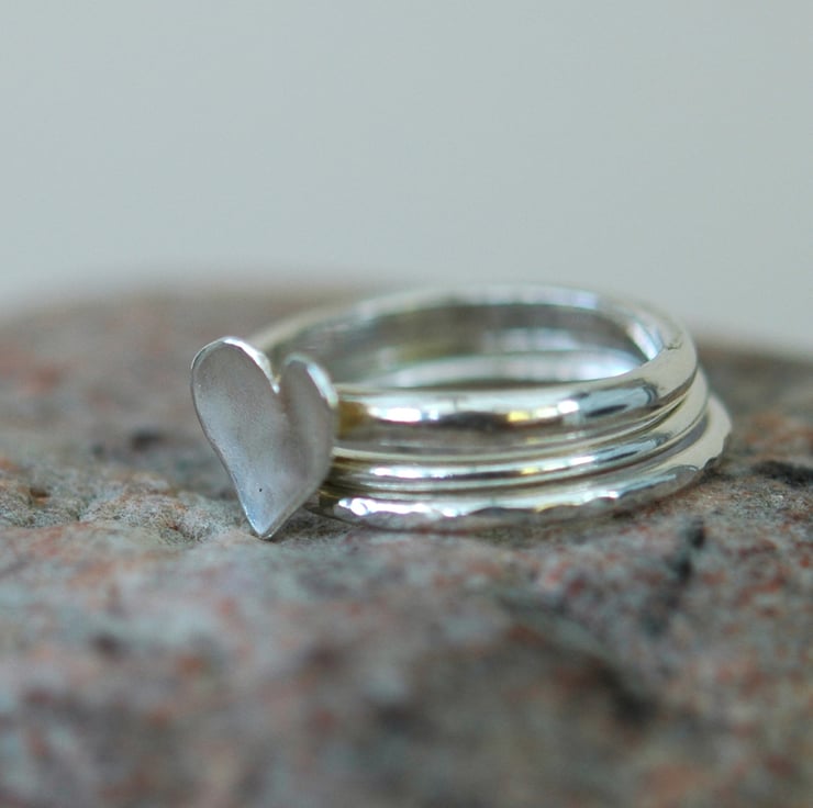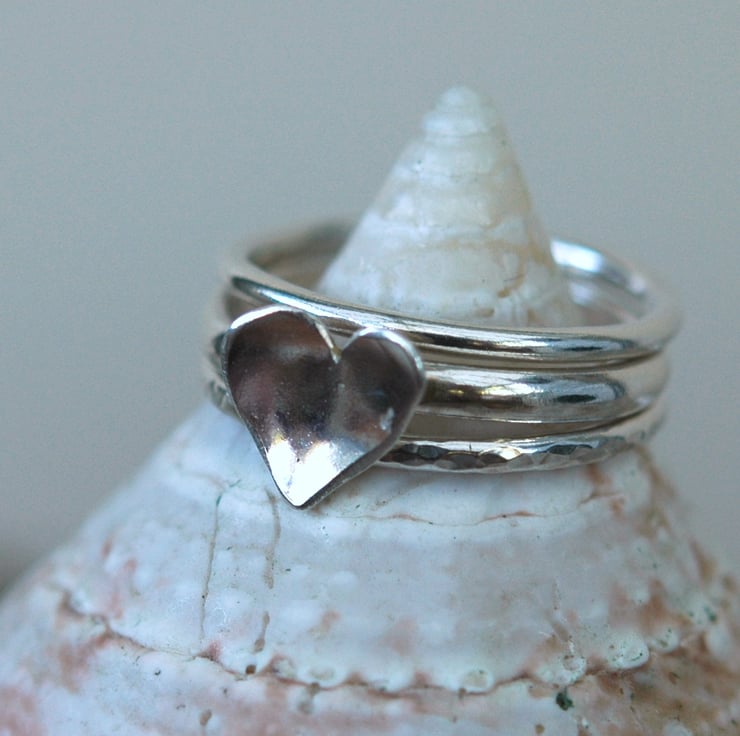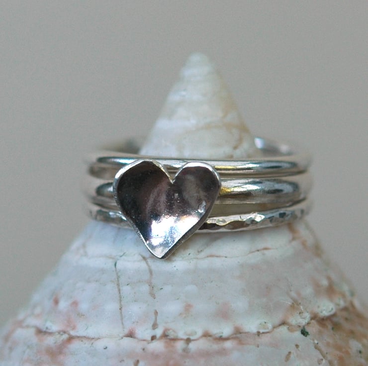 This gorgeous set of three sterling silver rings features a domed silver heart, cut by hand from sterling silver sheet and mounted on a 2mm D-shaped ring.. The other two rings are 1.2mm wide, one plain round and one hammered. The rings can be worn together or separately and the set is available in size O. They will be packaged in a smart gift box and sent by Royal Mail first class post.