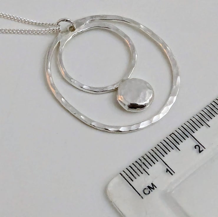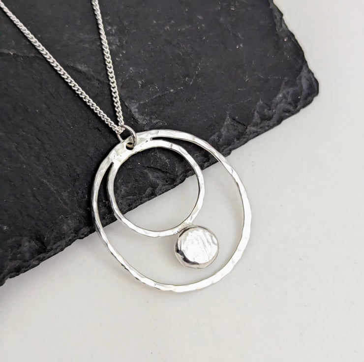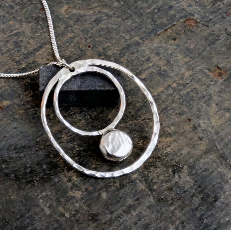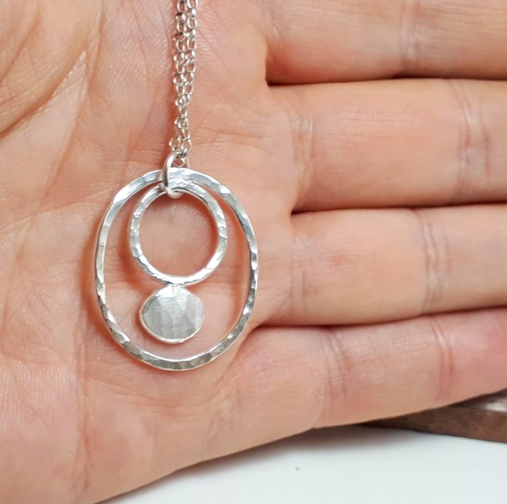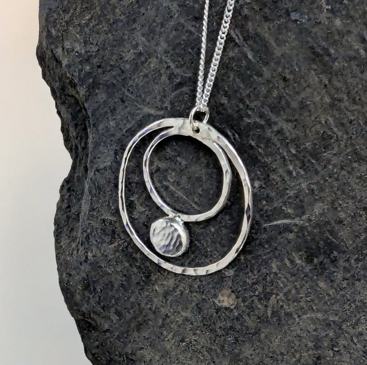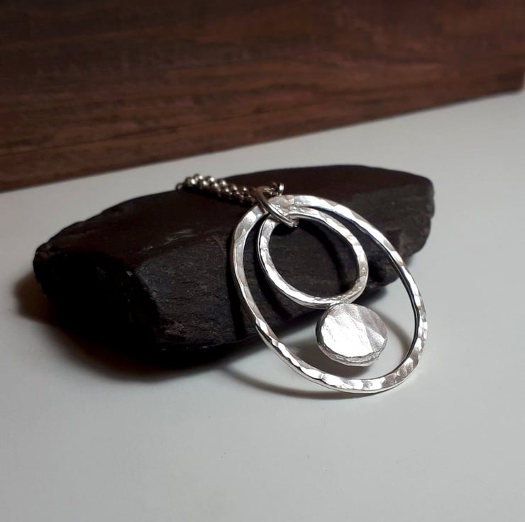 Hammered textured oval double hoop with a recycled hammered textured pebble.