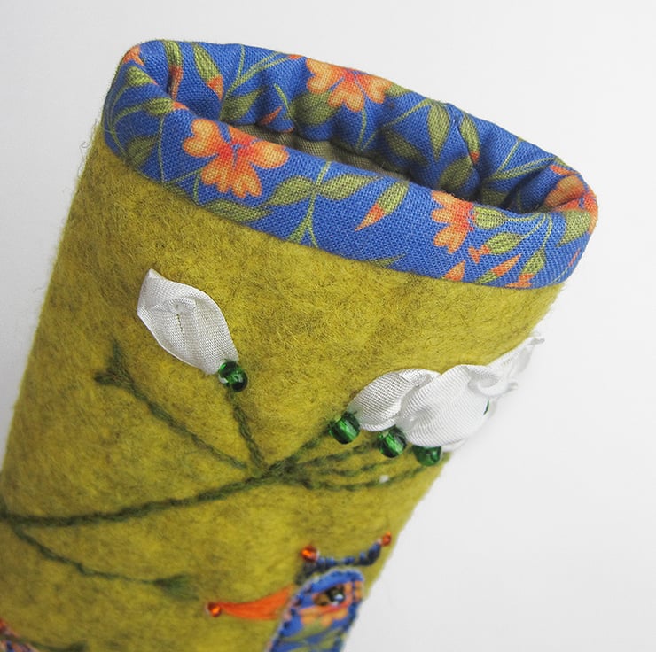 I have made the glasses case from mustard wool felt and hand embroidered a blue bird and shepherd's purse flower onto it with beading and ribbon embroidery details. It is lined with an up-cycled vintage silk scarf and trimmed with my own cotton print. The glasses case is wadded to protect your glasses. The item measures 17.5cms(7 inches) by 7.5cms(3 inches).