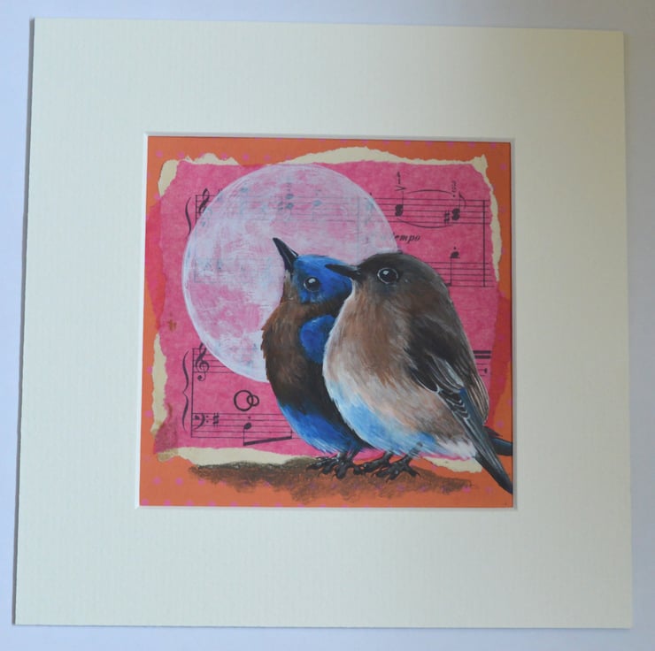 This is an original hand painted collage depicting two little birds serenading in the moonlight. I created this piece using brightly coloured patterned paper, sheet music and tissue paper. The birds have been painted on using acrylics.