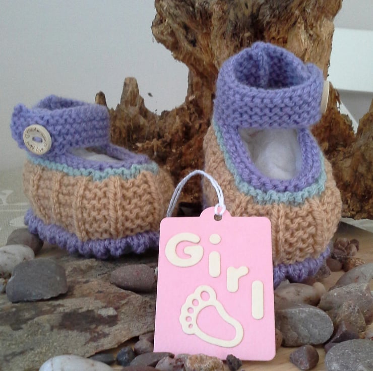 A very sweet pair of warm practical baby shoes created from quality double knit yarns. The yarns are guaranteed machine washable by the manufacturers therfore perfect for today's modern busy mums.