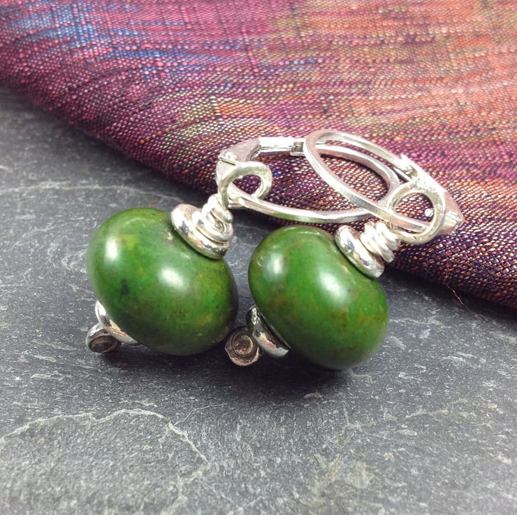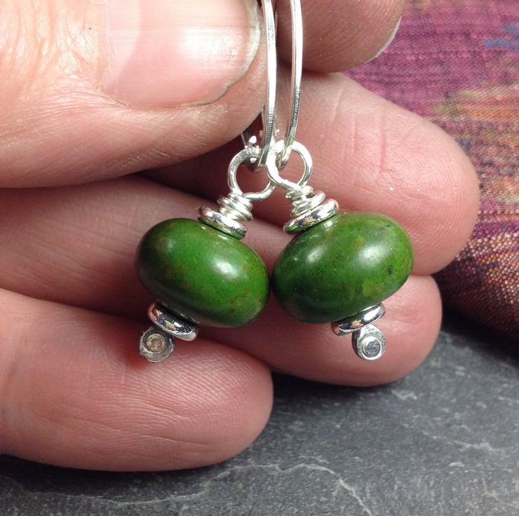 10mm Plump green turquoise beads are combined with my handmade silver head pins and washers. Hung from sterling silver hoops or hooks