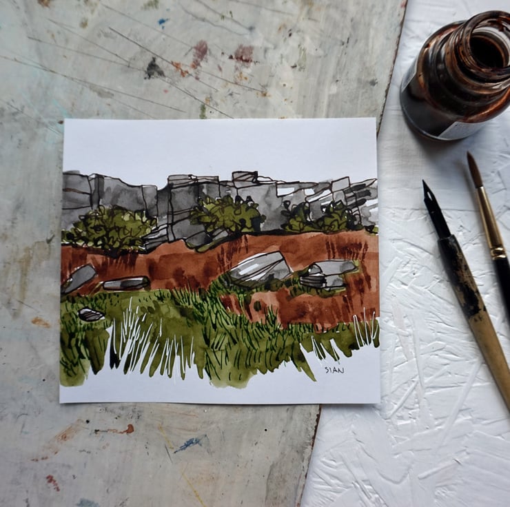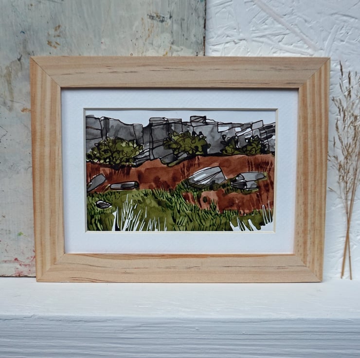 This is an unframed original ink painting of an upland moorland landscape. Inspired by an autumn walk through Stanage plantation underneath Stanage edge, a millstone grit outcrop in the Derbyshire Peak District National Park. This area is close to Sheffield and is very popular for climbing and bouldering. This sketch would make a great gift for someone who loves the Peak Park, climbing, hiking, countryside and the outdoors.
