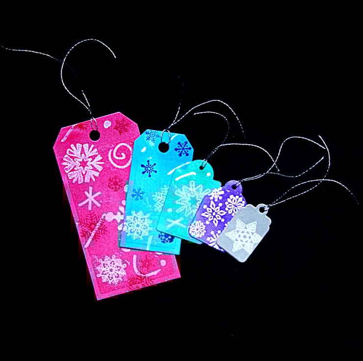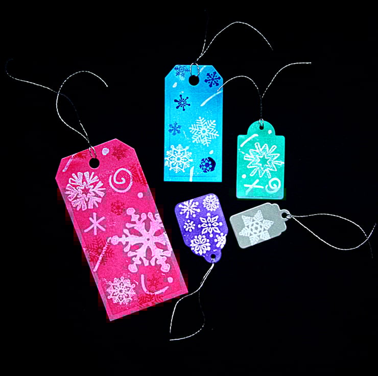 This set of handcrafted Christmas gift tags are cut from 300gsm white card which has been handstamped and powder heat embossed with snowlakes. The heat embossed images provide a resist to the colour which has been added by hand. The reverse of each tag is the main colour from the front - also hand applied.