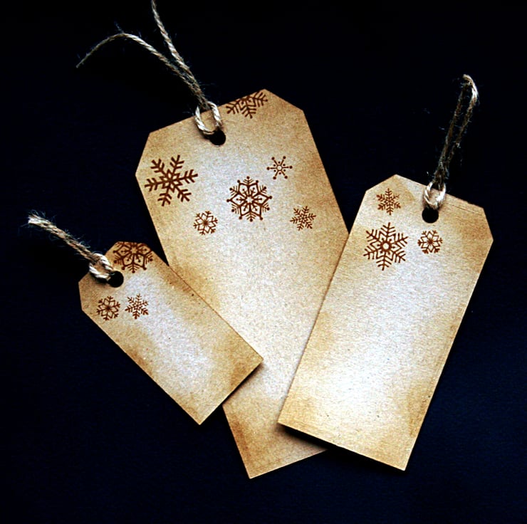 These handcrafted Christmas gift tags arecutfrom 300gsm brown kraft card which has been hand coloured and then handstamped with images of snowflakes. A cream coloured border has been added to the bottom of each tag. The reverse of each tag has also been handcoloured and handstamped.