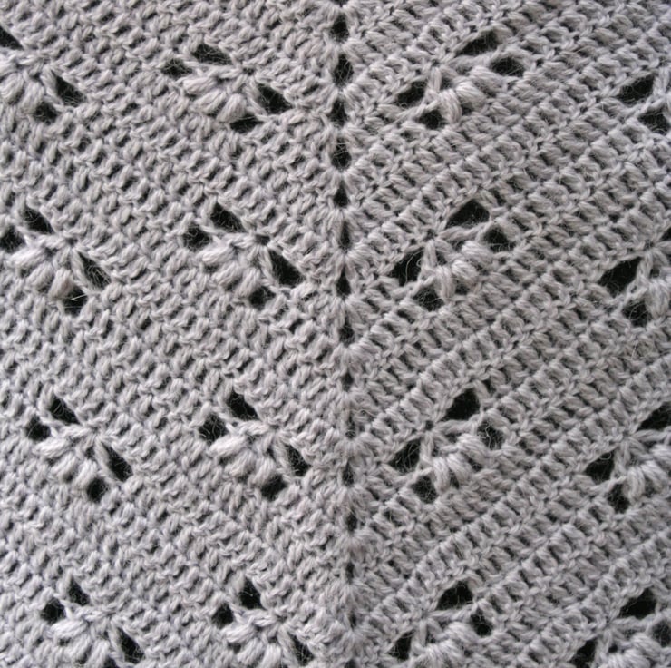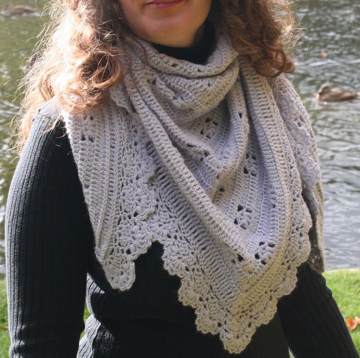 A 100% alpaca crochet shawl in a modern, neutral, soft grey.