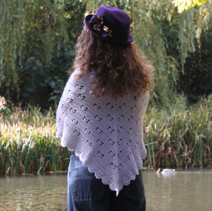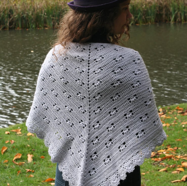 The great thing about this shawl is that it can be worn in multiple ways, for example, as a scarf around your neck, draped around your shoulders or more traditionally as a shawl over your back and and arms. I love to wear this style over a coat, wrapped around my neck while out and about, then wrapped around my shoulders for extra warmth while sitting, enjoying the autumn colours outdoors or when it gets a bit chilly indoors.
