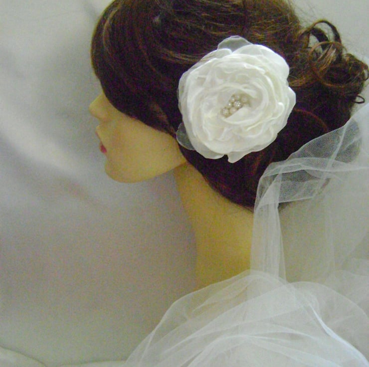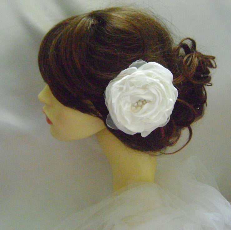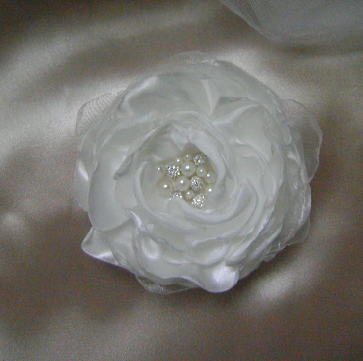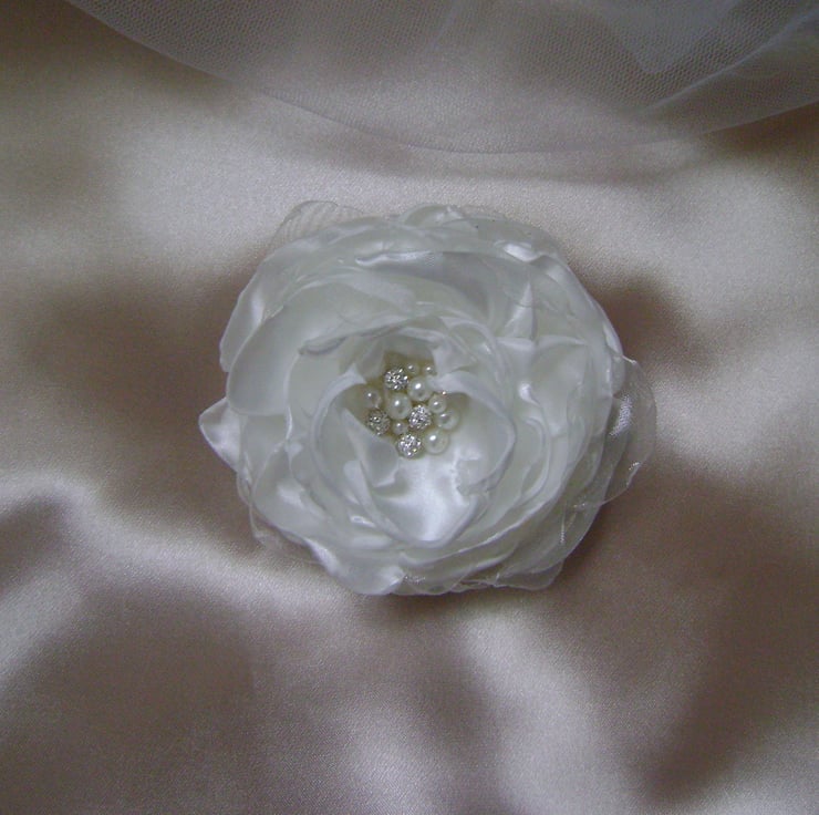 An absolutely beautiful bridal hair flower, created using luxurious silky and organza petals that have been handmade by myself. The centre of the piece has white glass pearls and sparkling crystal pave beads to compliment the design.