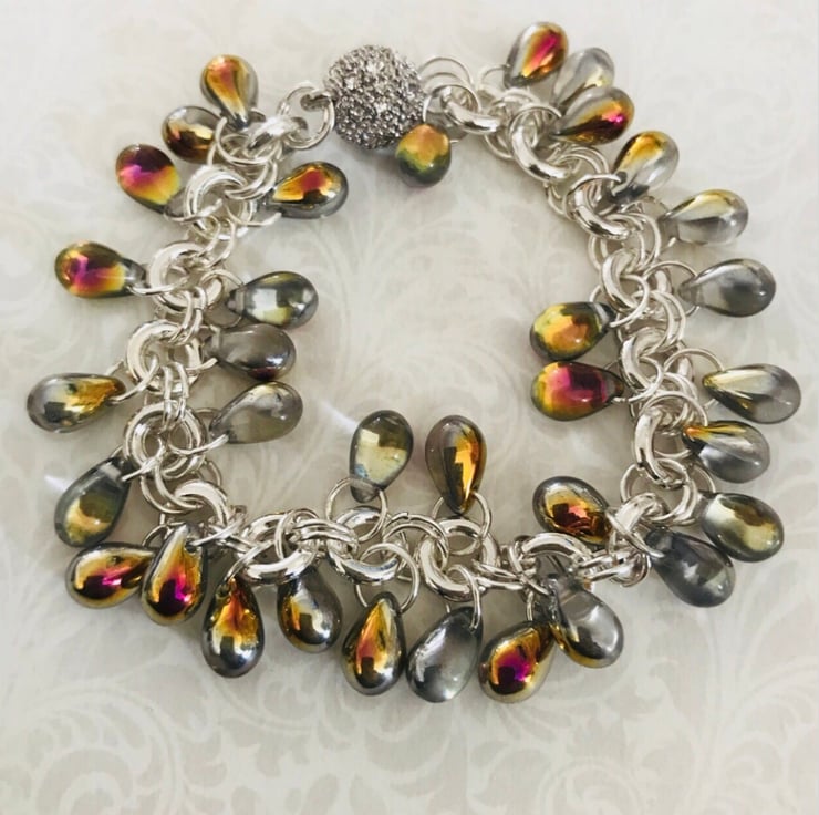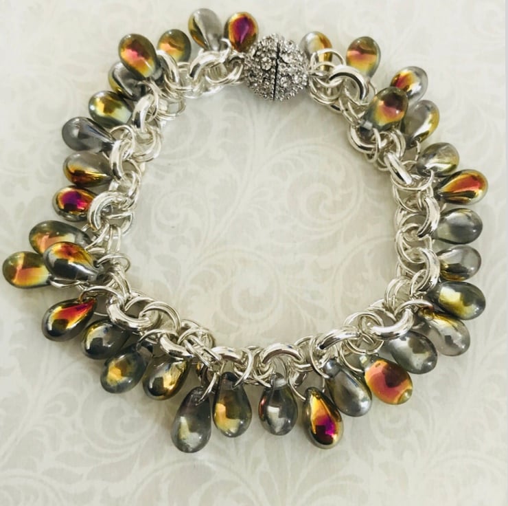 Czech glass holographic beaded bracelet. Magnetic rhinestone encrusted ball fastening. Approx 17 cms in length.