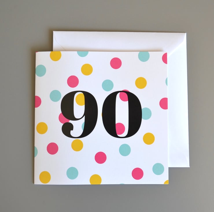 Birthday cards made for those significant ages worth a special mention! With a dotty celebratory-feeling pattern in bright pink, deep yellow and aqua on a crisp white background. The age is in black text in the centre of the card.