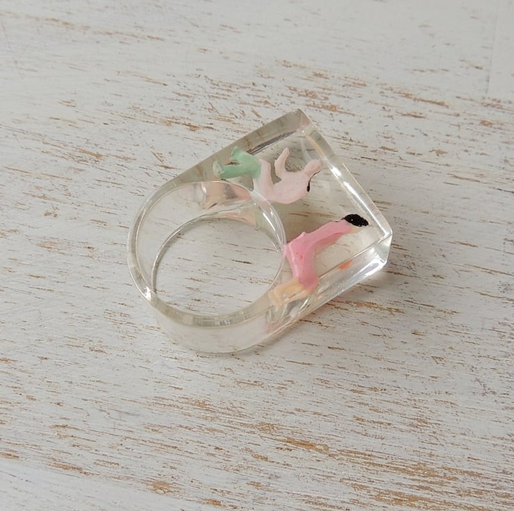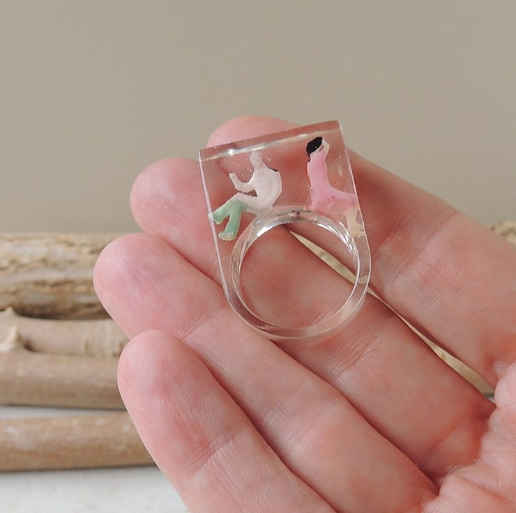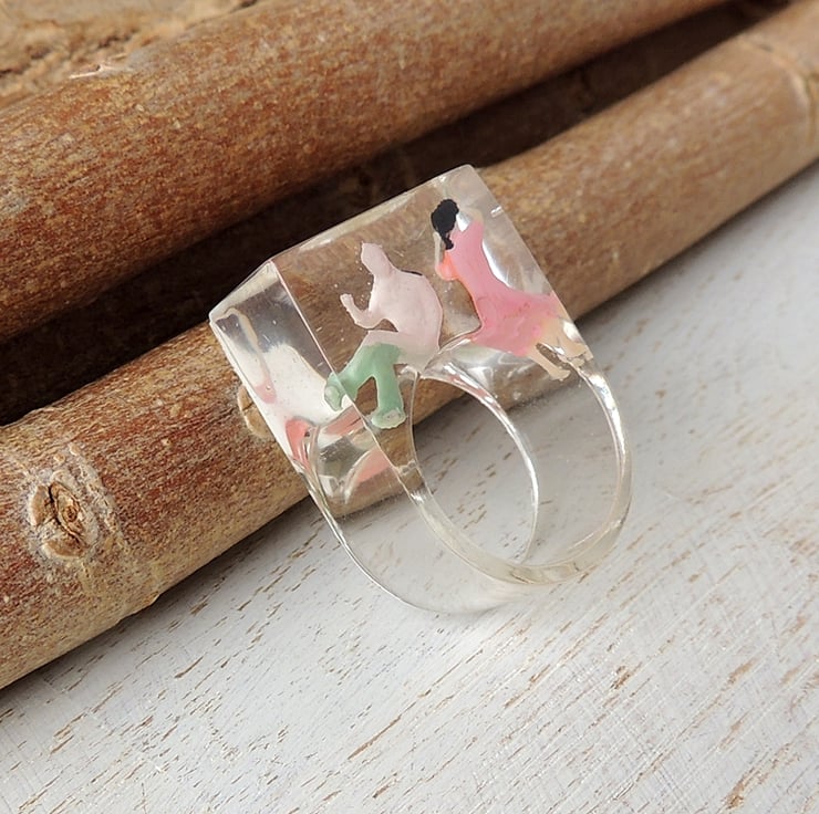 This large statement ring has two little plastic people captured inside a chunky resin ring.