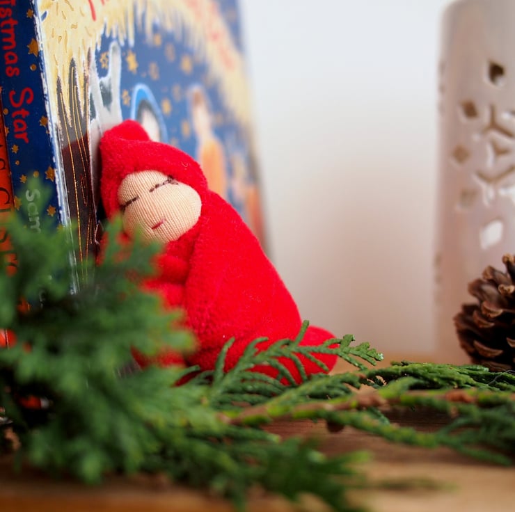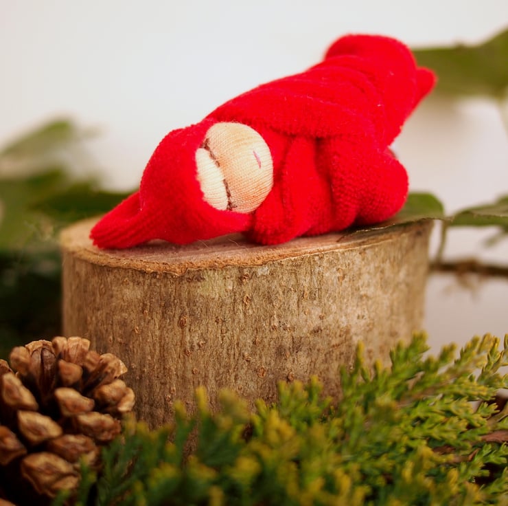 This tiny little red baby doll is inspired by the Waldorf tradition of doll making and uses natural materials. He is so small and cuddly that any child would love to pop him in their pocket and take him everywhere! He is approximately 3" tall.