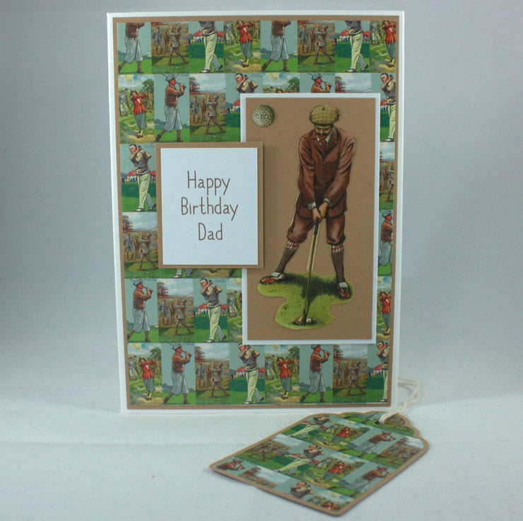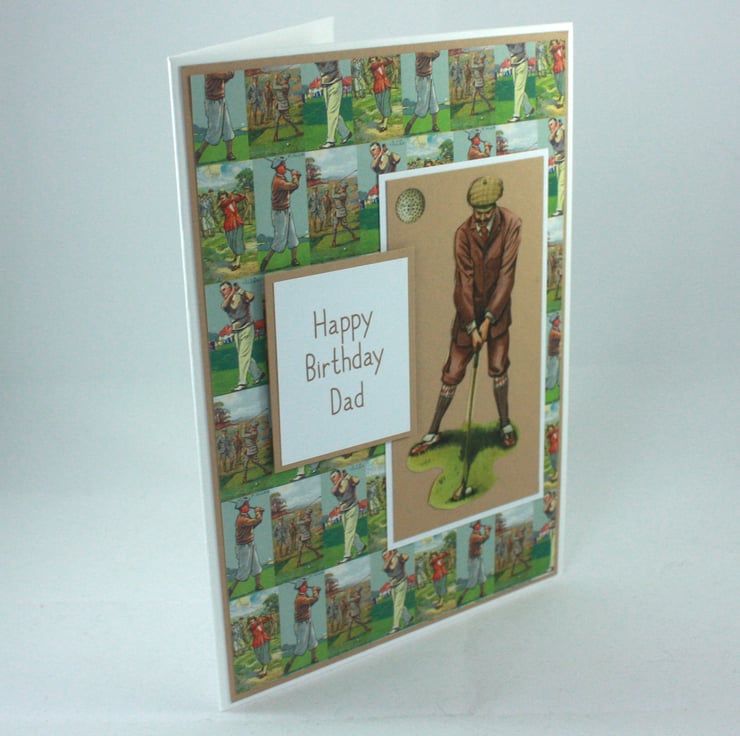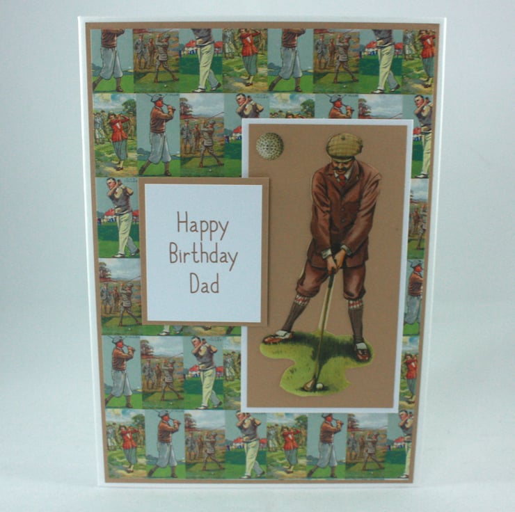 Vintage style birthday card featuring an embossed image of a golfer, overlaid onto coffee and white card and onto vintage background paper made up of miniature pictures of golfers. The message reads 'Happy Birthday Dad'.