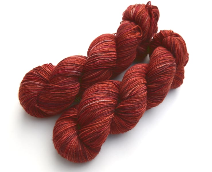 Autumnal chestnutty red-browns. This is a 4-ply weight yarn with a a versatile superwash merino base, with cosy, soft yak fibre and a little nylon for strength. The natural grey colour of the Yak gives the colours beautiful richness and depth. There is one skein left. Photos taken and edited in bright natural light.