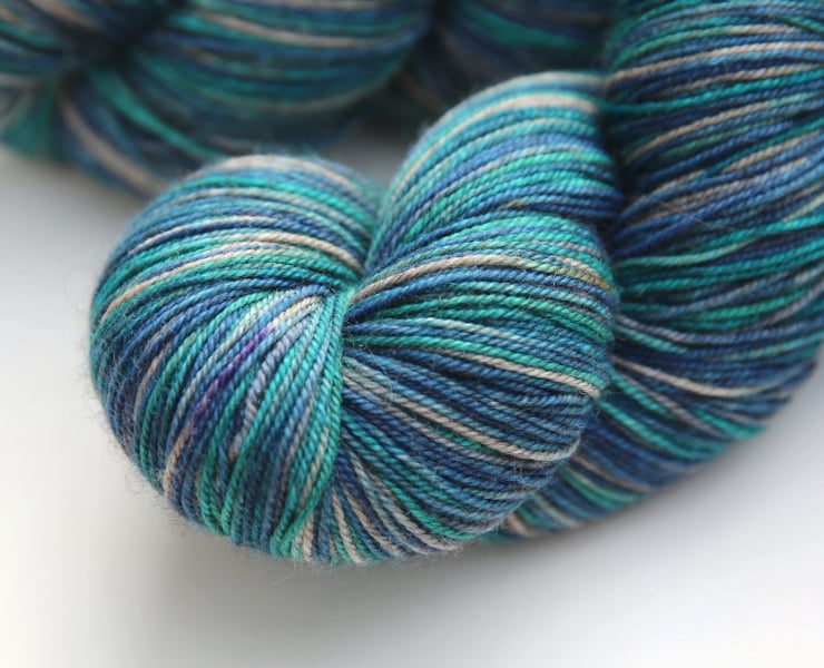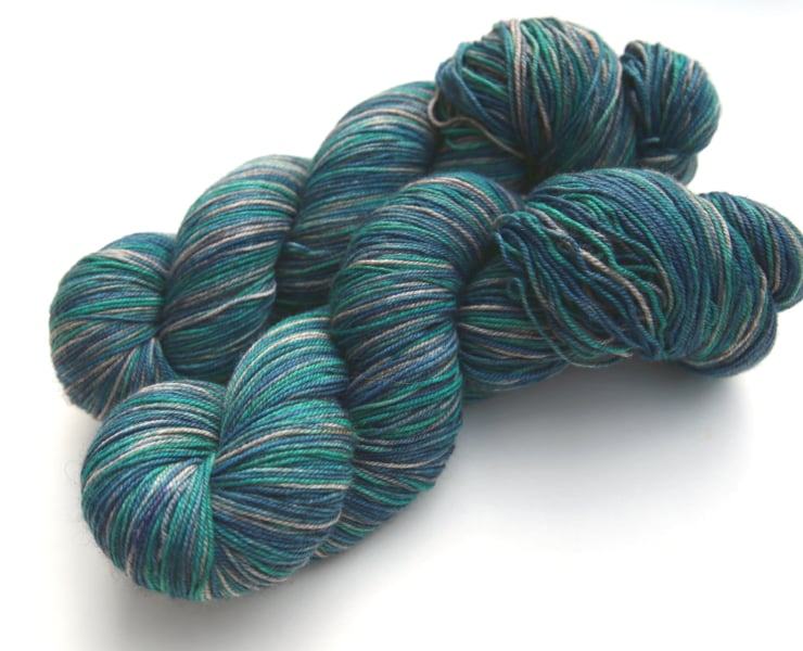 Shades of mottled blues with teal and grey (undyed). This is a 4-ply weight yarn with a a versatile superwash merino base, with cosy, soft yak fibre and a little nylon for strength. The natural grey colour of the Yak gives the colours beautiful richness and depth. There is one skein left. Photos taken and edited in bright natural light.