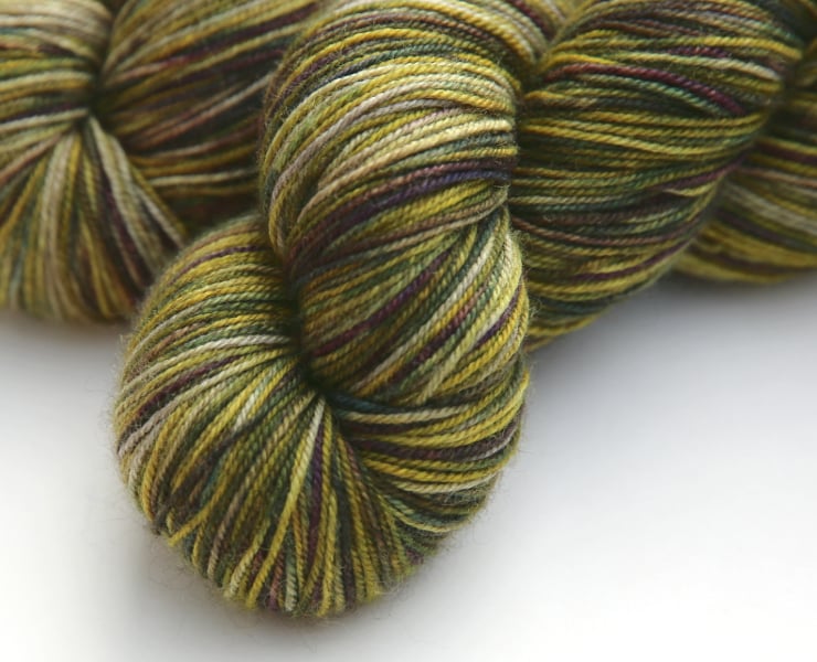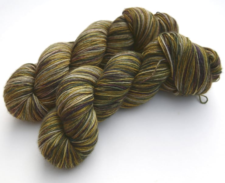 Shades of mottled greens with brown and grey (undyed) with the odd touch of purple. This is a 4-ply weight yarn with a a versatile superwash merino base, with cosy, soft yak fibre and a little nylon for strength. The natural grey colour of the Yak gives the colours beautiful richness and depth. There are two skeins available (price shown is for one). Photos taken and edited in bright natural light.