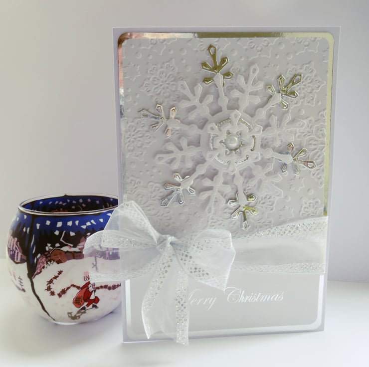With a Mirror card background which has a white snowflake embossed top