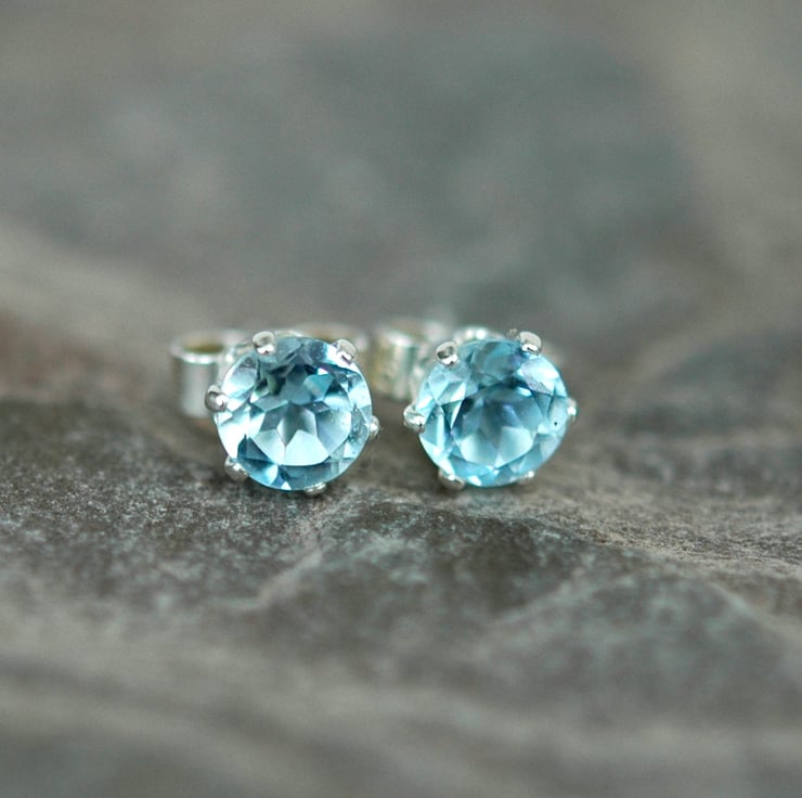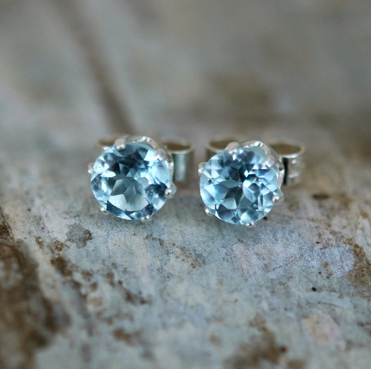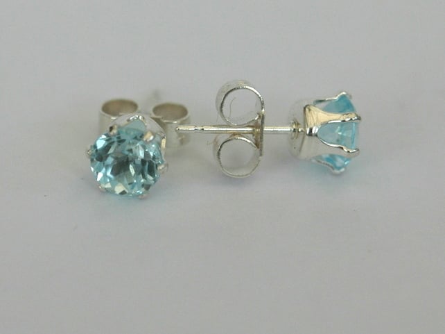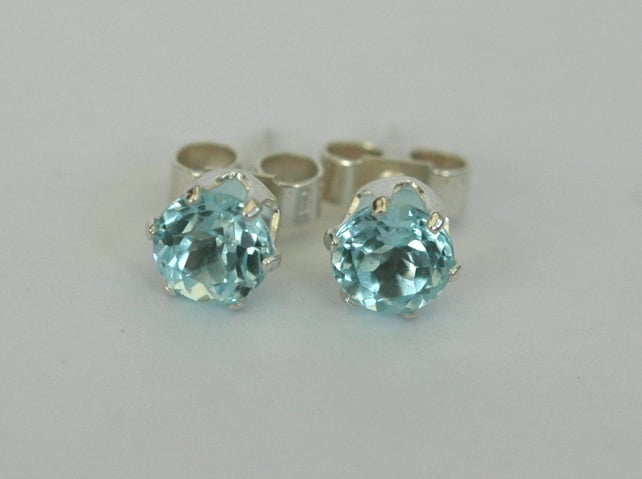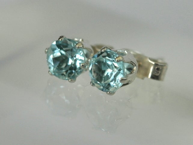 These pretty earrings feature faceted sky blue topaz gemstones set in sterling silver. Sky blue topaz has a clear pale blue colour like the sky on a summer's day. The blue colour is enhanced by irradiating the stone and sky blue is the lightest of the blue shades. The stones shown here are round and 5mm in diameter, set in a sterling silver claw setting with ear posts and butterfly scrolls, stamped '925', indicating the purity of the silver. The studs are lead and nickel free.