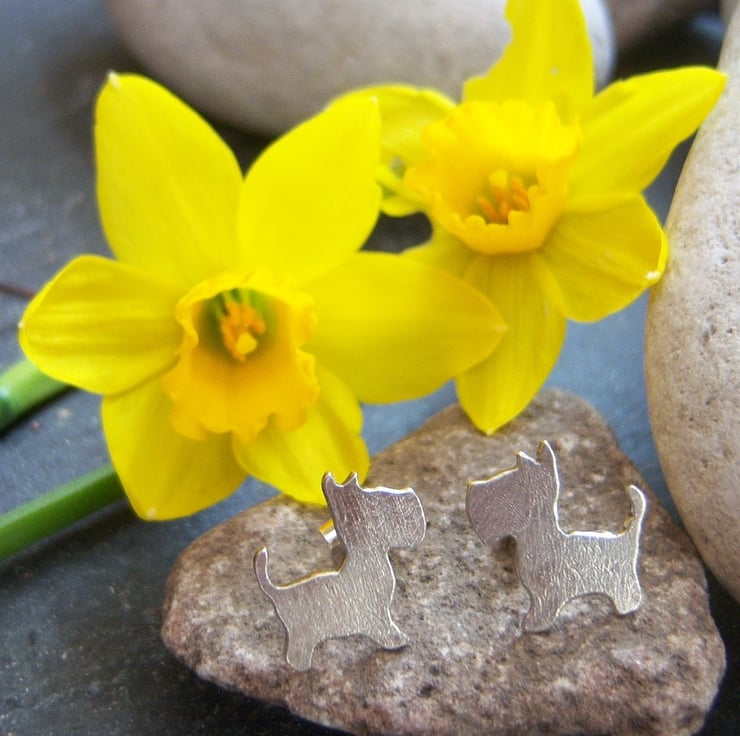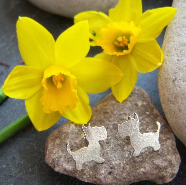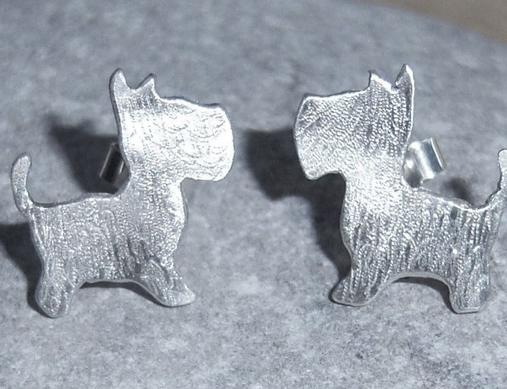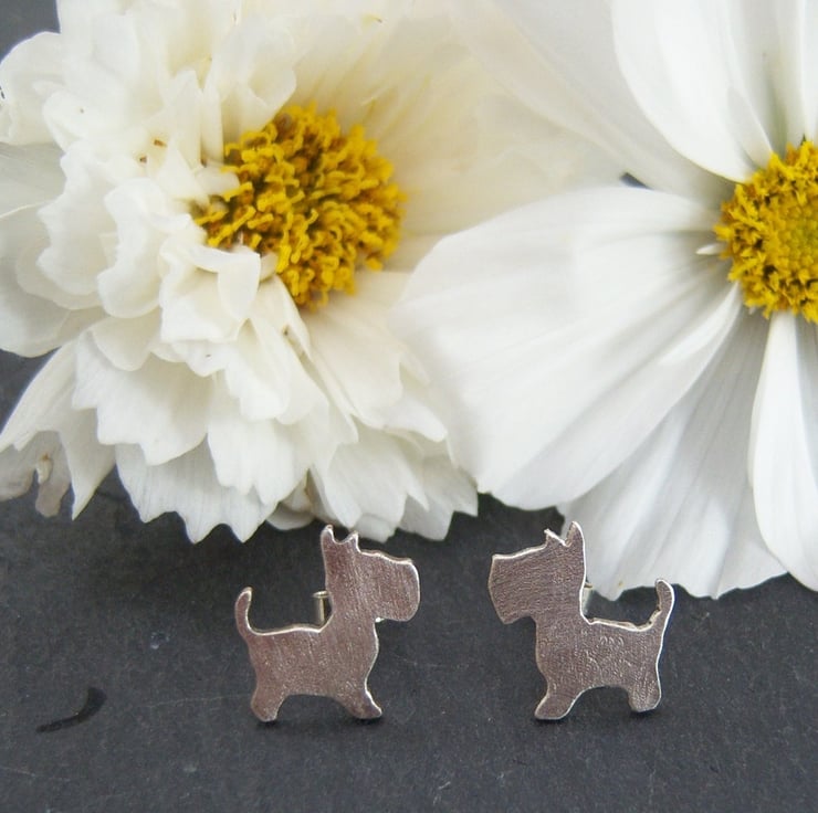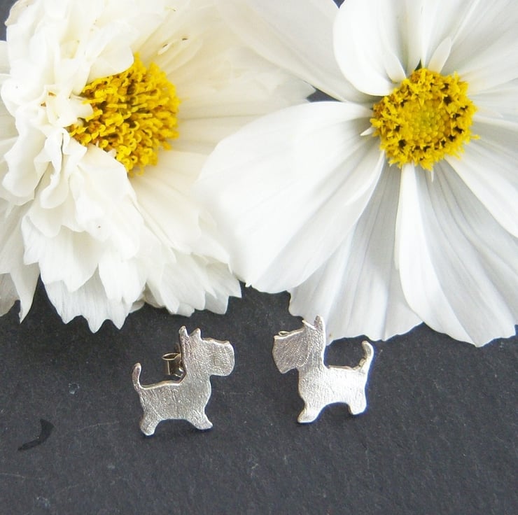 Sterling silver stud earrings in the shape of a dog, quite possibly a westie or a scottie? Certainly a terrier. Textured, they are approximately 1.5 cms across.
