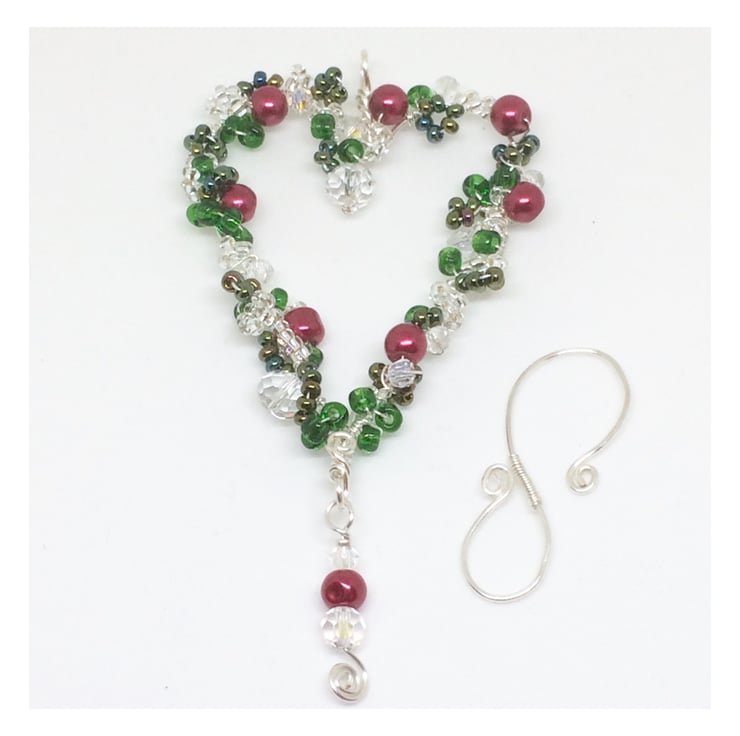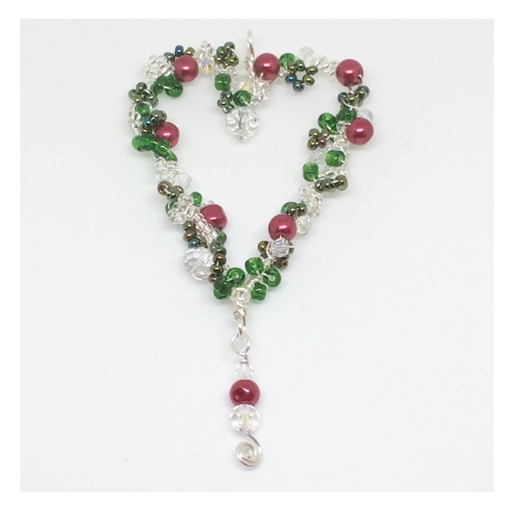 I have formed the heart shape with silver plated wire using wire wrapping techniques. A variety of beads, red glass pearls, Czechs crystals and green and silver seed beads have been wrapped around the heart shape. The heart is completed with an 's' shaped hook.