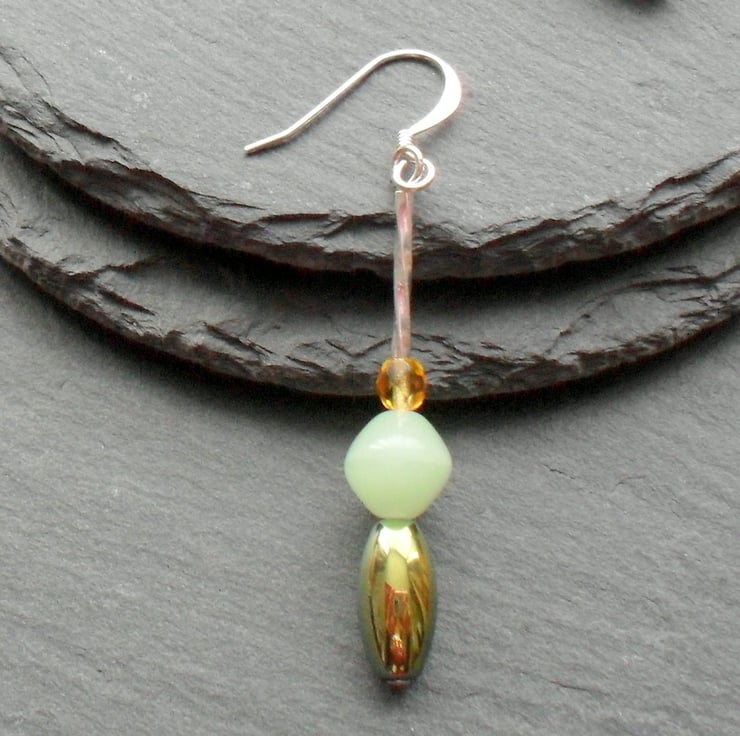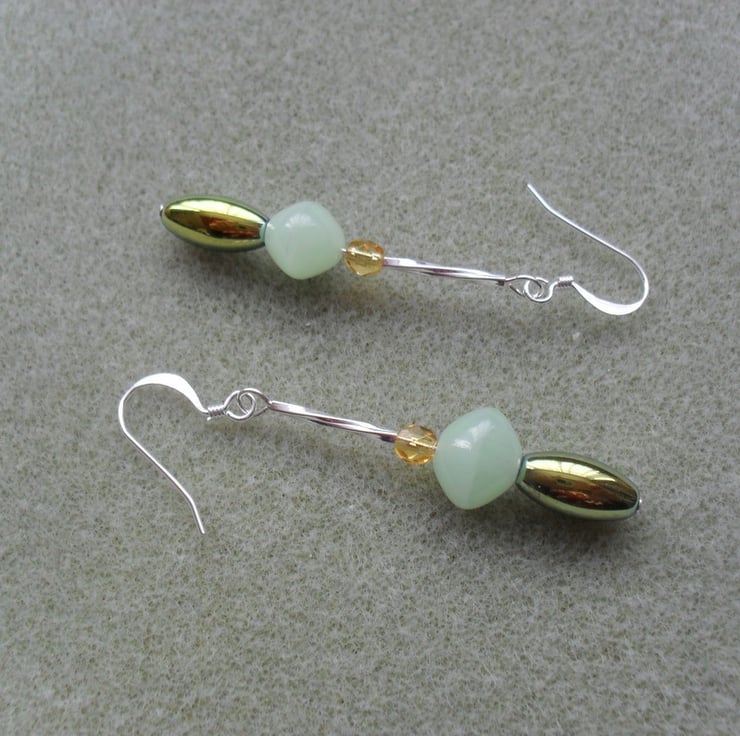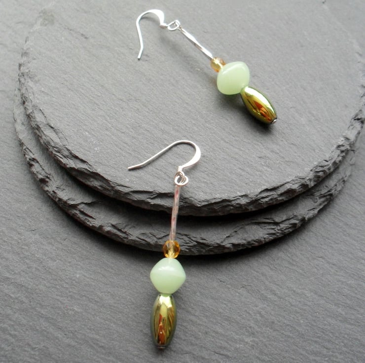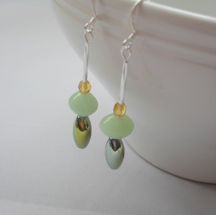Drop earrings with coated haematite rice shaped beads and Czech glass are attached to silver plated ear wires.
