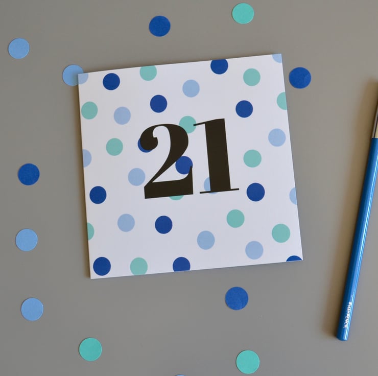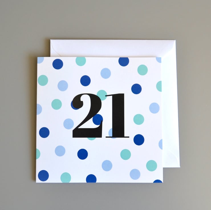 Birthday card made for those significant ages, with a dotty pattern in light blue, navy and aqua on a crisp white background. Age in black text in the centre of the card.
