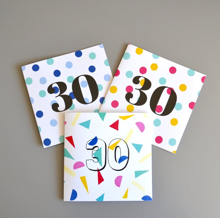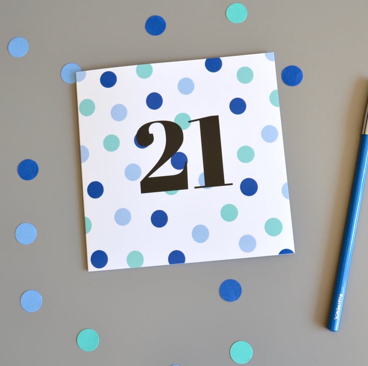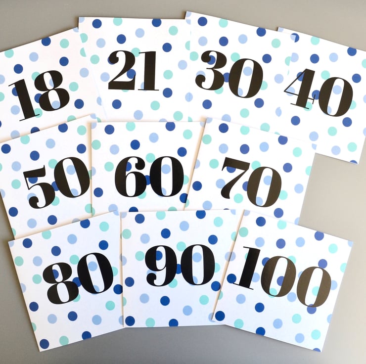 Birthday card made for those significant ages, with a dotty pattern in light blue, navy and aqua on a crisp white background. Age in black text in the centre of the card.