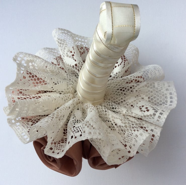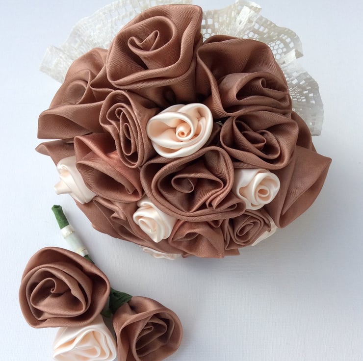 Rose gold and blush pink, hand made, fabric rose bride's bouquet with a cream ribbon wrapped handle and cream lace cuff, with a matching buttonhole for the groom. It is a one off and would be unique to you. The bouquet has twenty-four wired roses, is approximately 20cm wide and 22cm high.