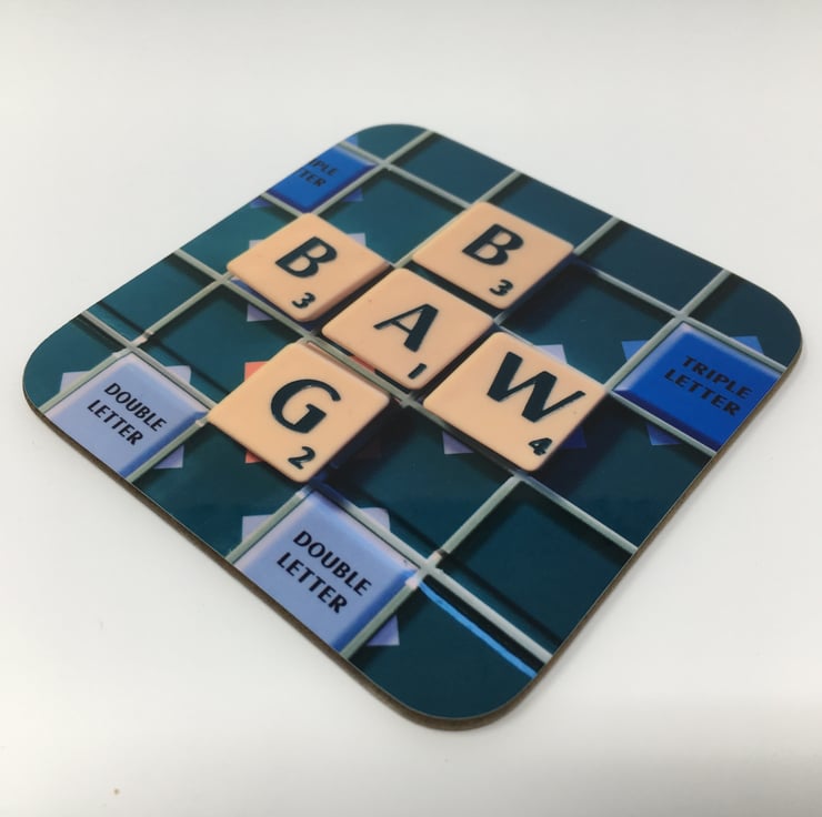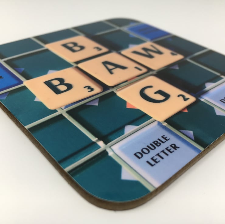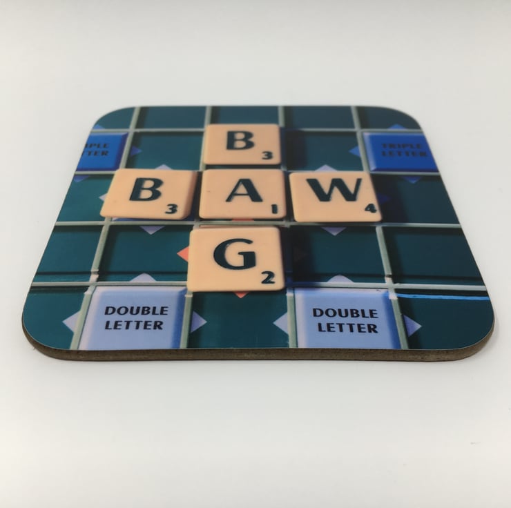 My original Bawbag scrabble image reimagined on this super glossy coaster