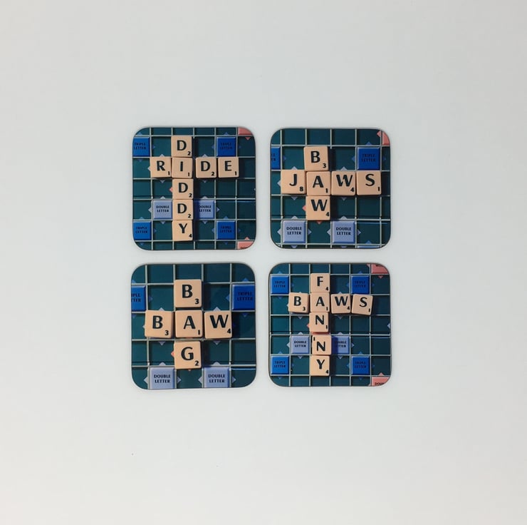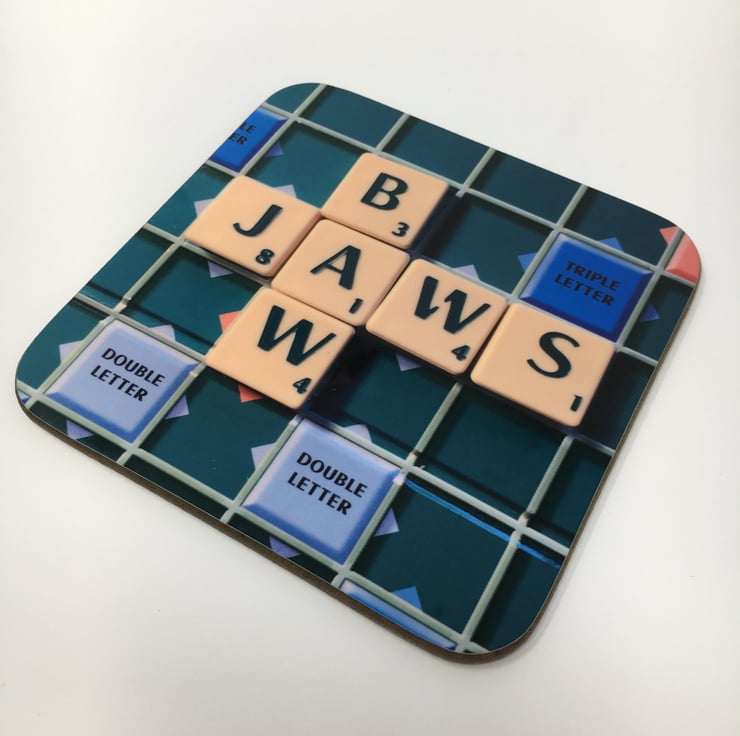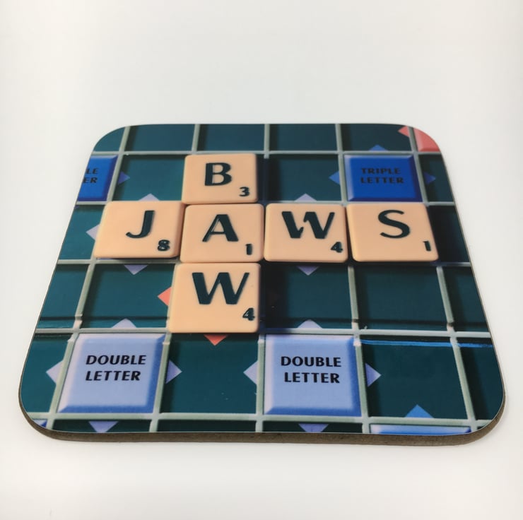 My original Bawjaws scrabble image reimagined on this super glossy coaster