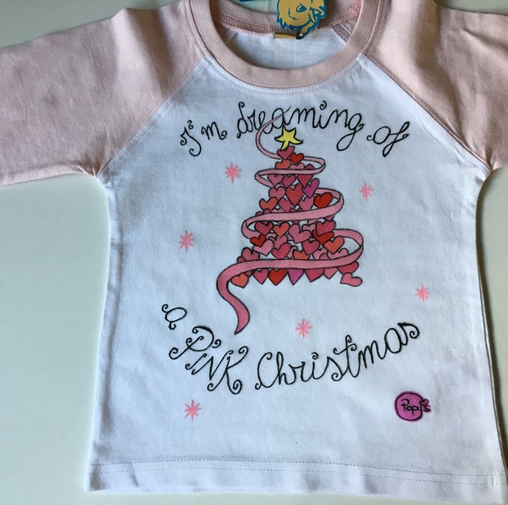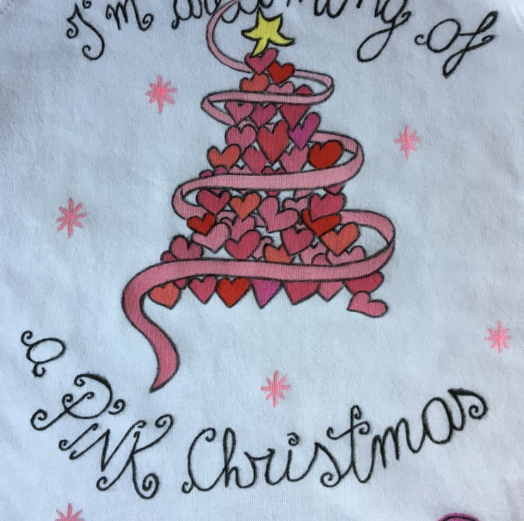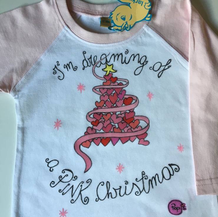 Thank you for looking at this pink, Christmassy long sleeves t-shirt hand painted & designed by me! It features a Christmas tree made by pink hearts. This t-shirt is now on sale, it used to be £ 8.00.
