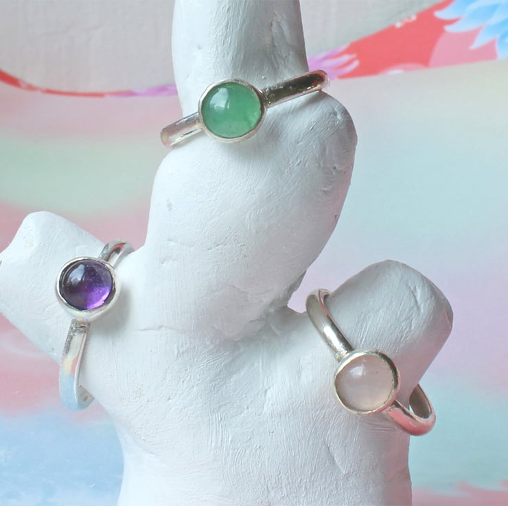 A classic design of silver gemstone ring. These feature the gemstones amethyst, pink quartz and green aventurine - fine and fancy polished stones.