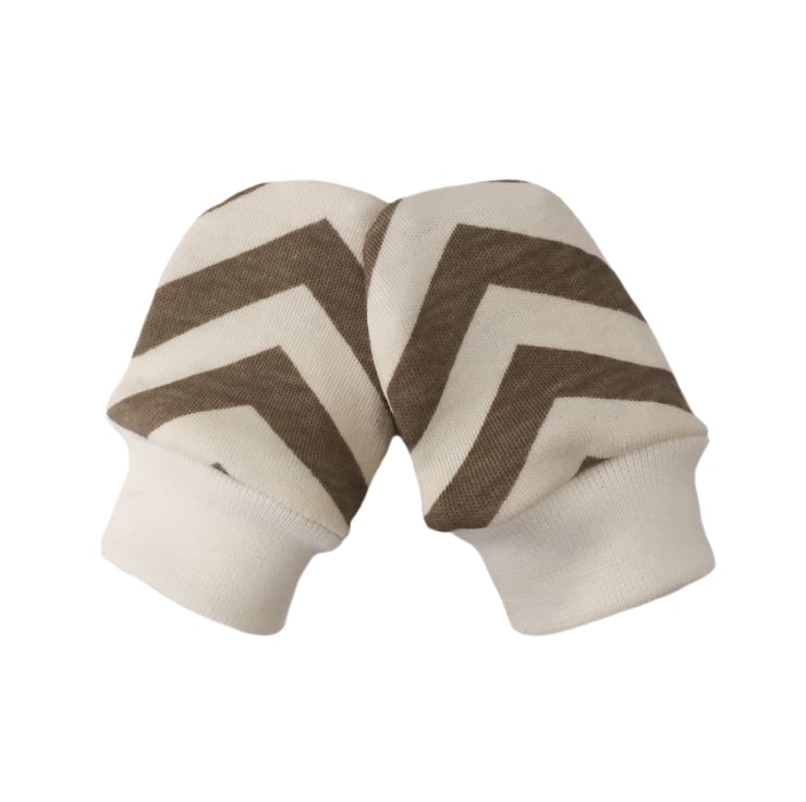 Super cute, comfy & easy to wear Modern Scratch Mittens made from 100% Certified ORGANIC Cotton Knit (GOTS), which is printed with low impact dyes & is non toxic - no more scratched faces with these super soft Scratch Mittens in beautifully soft Coral Shroom Beige & Cream SKINNY CHEVRONS print fabric. (See last 2 pics for co-ordinating items - MATCHING SHOES AVAILABLE).