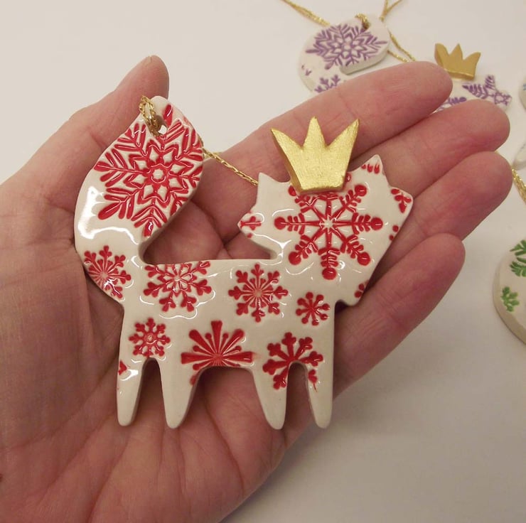 These cute little foxes are made from white earthenware clay - embossed with pattern and finished with a golden crown.