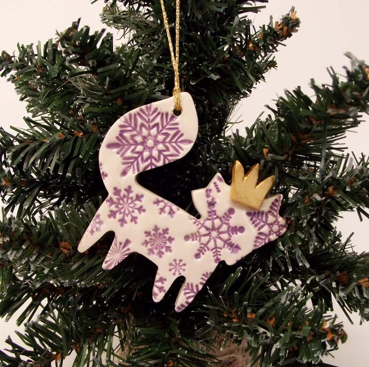These cute little foxes are made from white earthenware clay - embossed with pattern and finished with a golden crown.