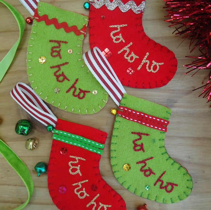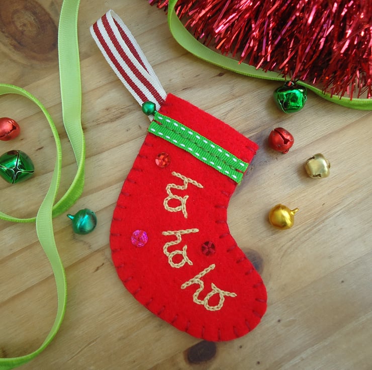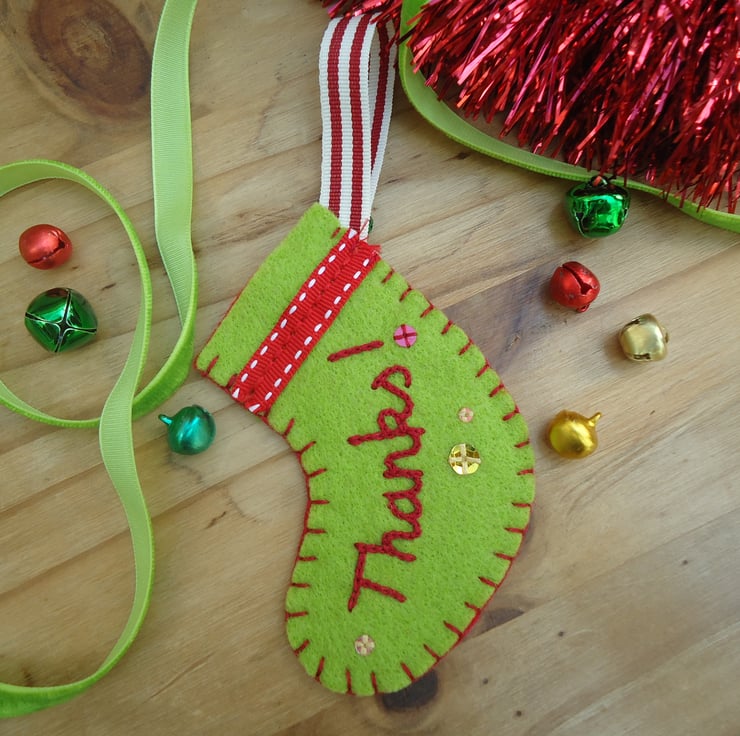 This little stocking measures approx. 10.5cm diagonally from hanging ribbon to toe, and approx. 4.5cm across the top. It has a bright red felt front, onto which is stitched 'ho ho ho' in gold, with the back a lime green felt, featuring 'thanks!' stitched in dark red.