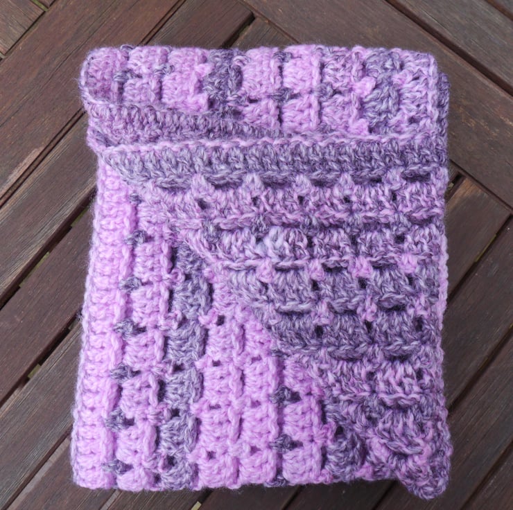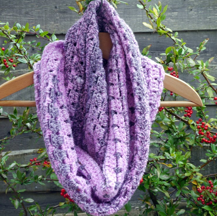 Soft, warm and cosy, this infinity scarf is perfect for the cool spring days and winter ones too. Crocheted using a lovely acrylic yarn which gives a lovely marbled effect. Can be worn either looped once or twice around the neck.