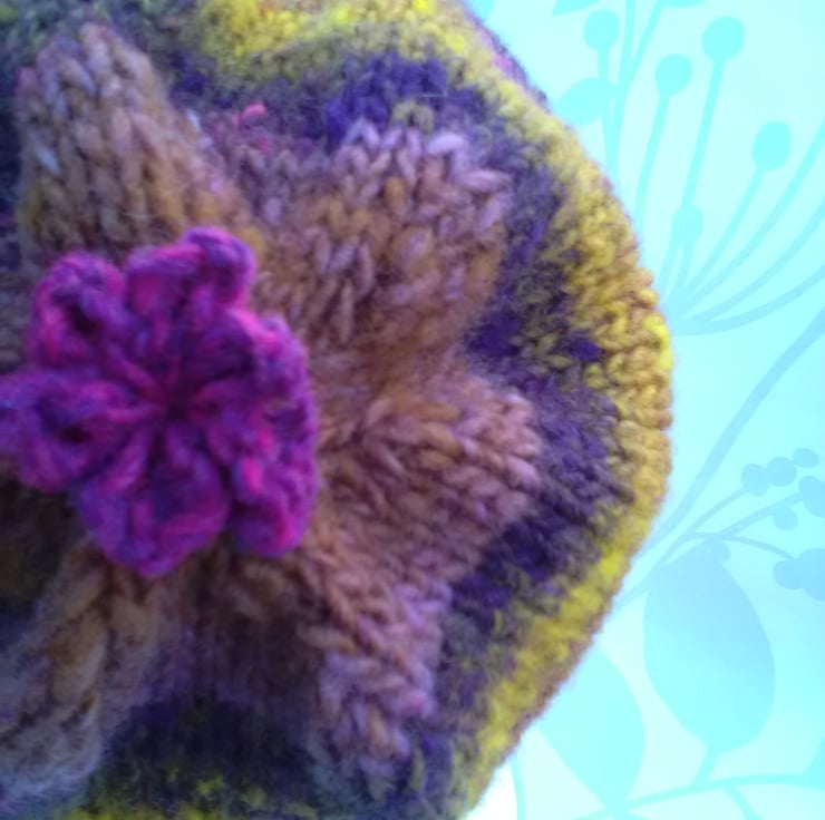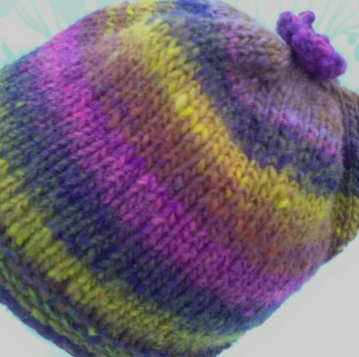 This hat has been hand knitted on the round to show off the self stripes of purple, pinks, yellow and teracotta.