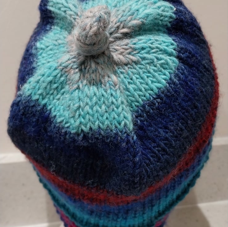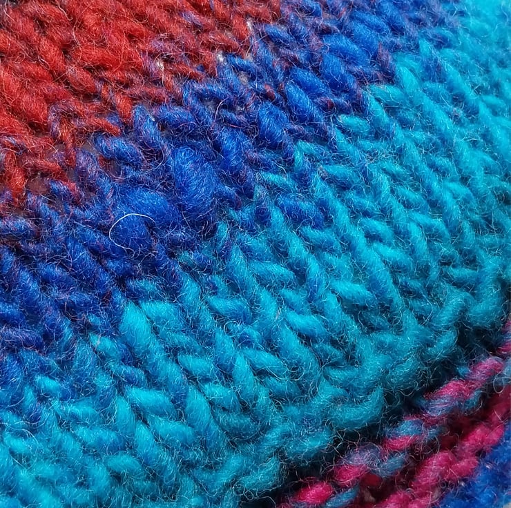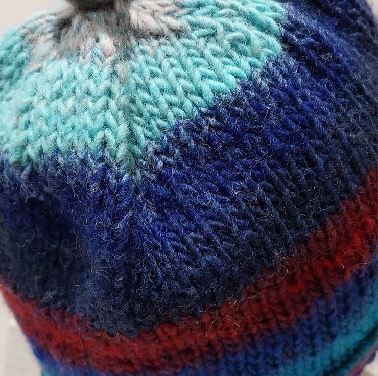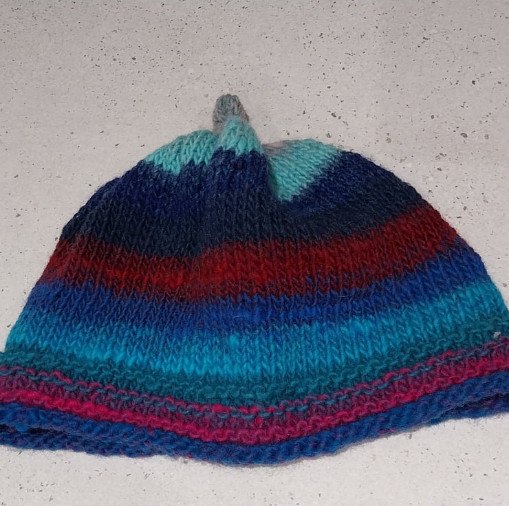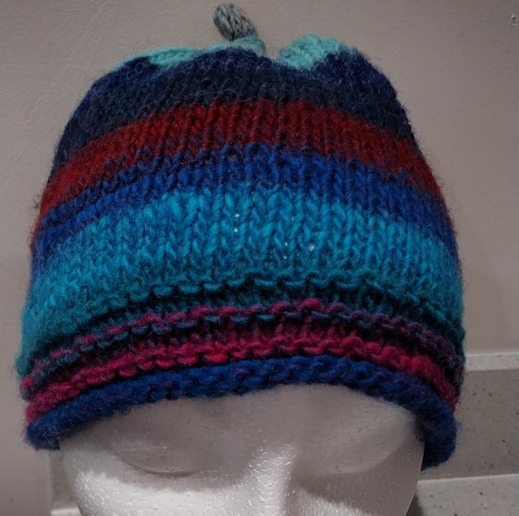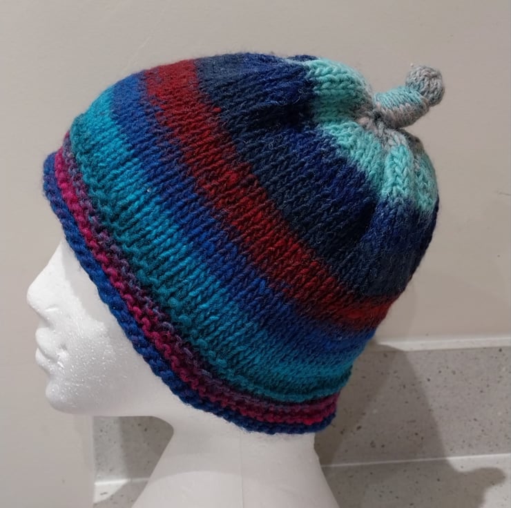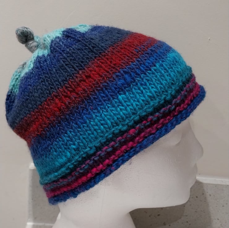 This hat has been hand knitted on the round to show off the self stripes of blues, turquoise, hot pink and dark red.