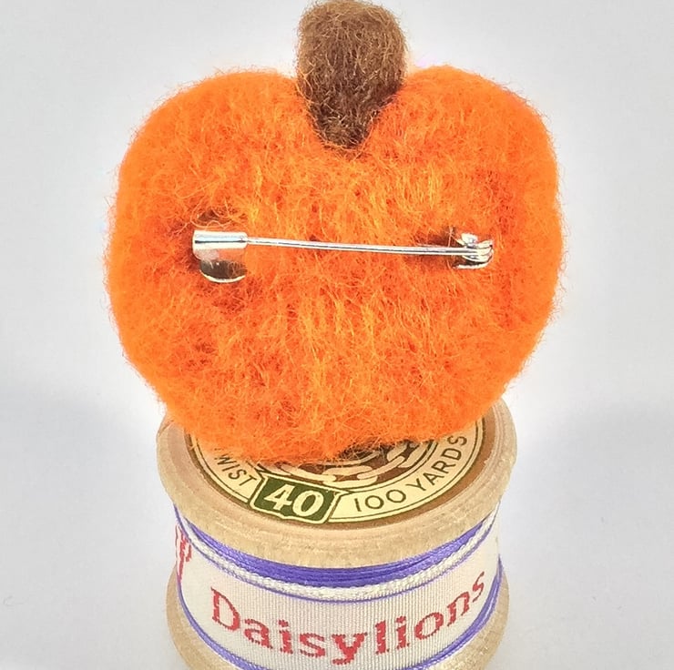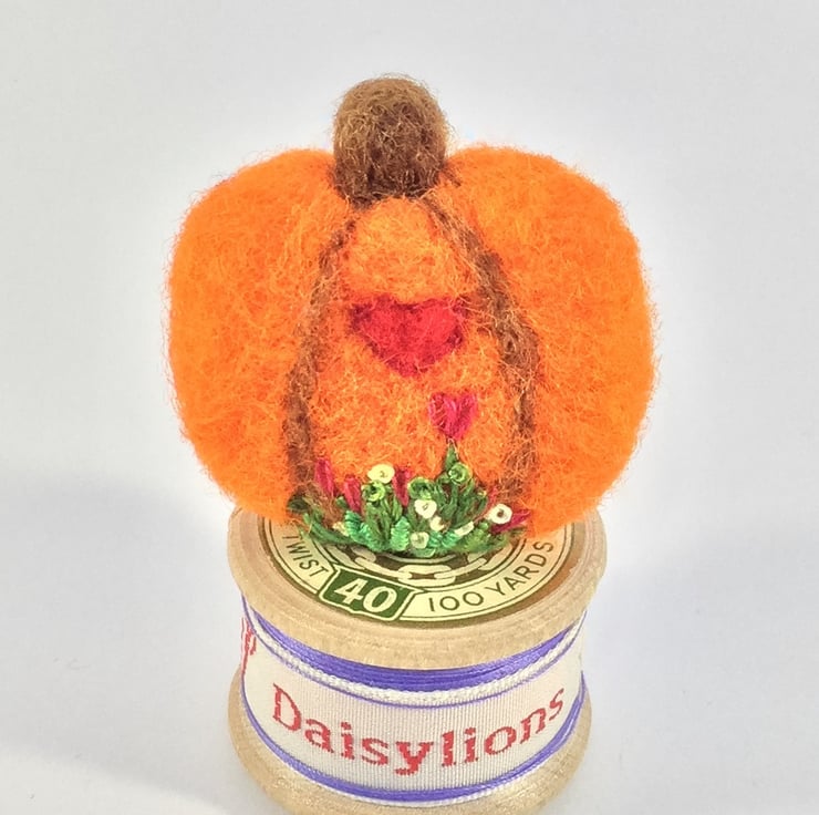 One needle felted pumpkin brooch. I have hand embroidered tiny detailed hearts and grasses at the bottom of this cute little brooch, using a variety of lazy daisy, french knot, and bullion stitches.