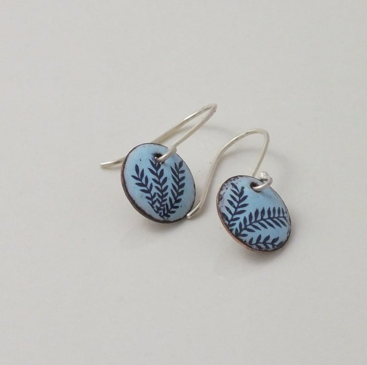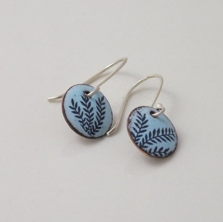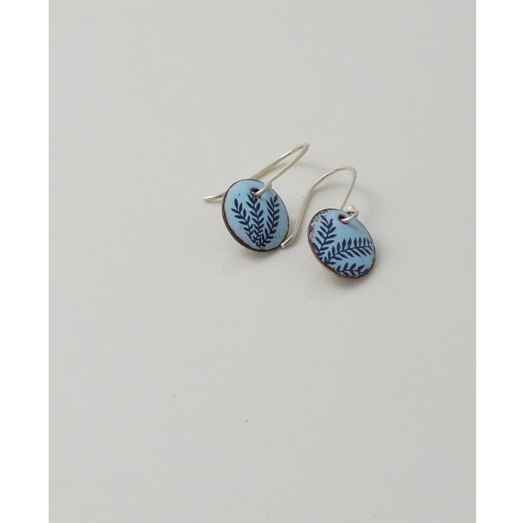 Pale blue enamelled copper earrings, decorated with dark blue fronds. The earrings are slightly domed and are suspended from handmade sterling silver wires