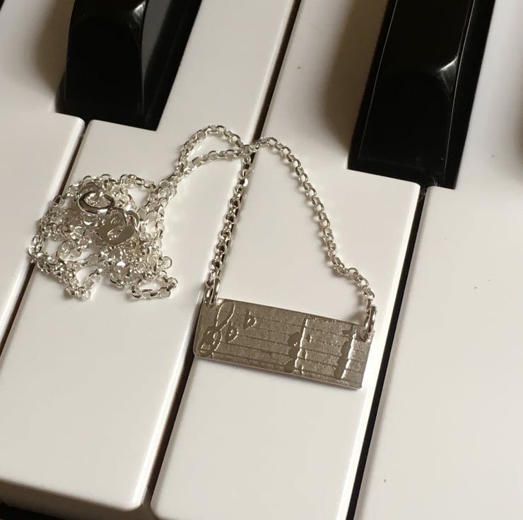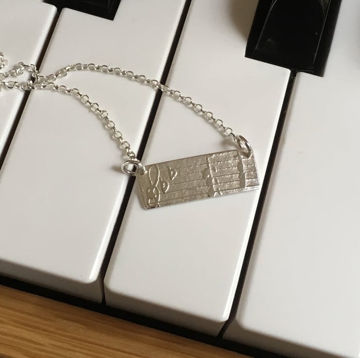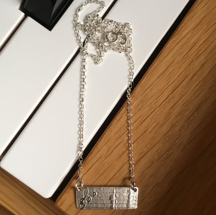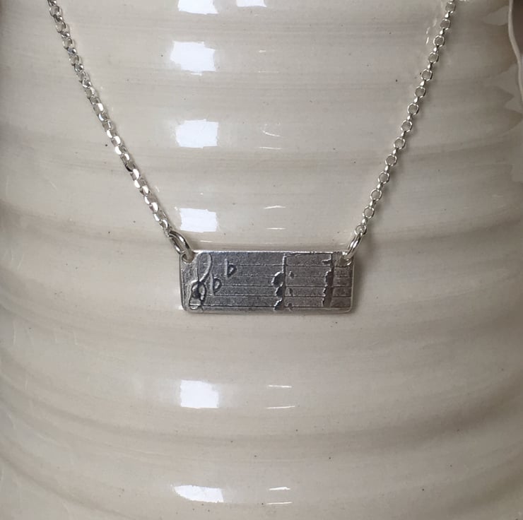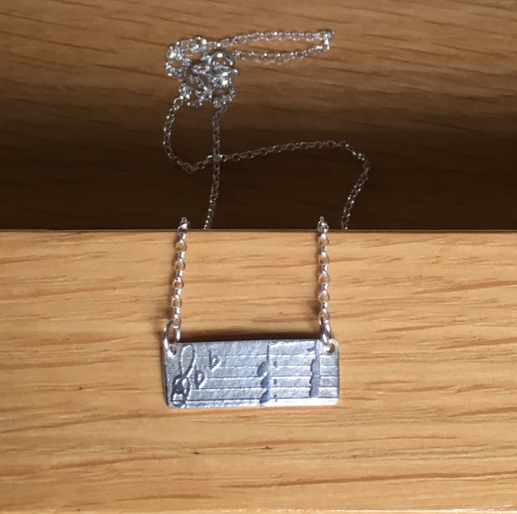This handmade sterling silver necklace has a rectangle of silver embossed with the pattern of sheet music. It is attached to a 16" (41cm) sterling silver belcher chain by two soldered rings and has been polished to a bright shine to finish.