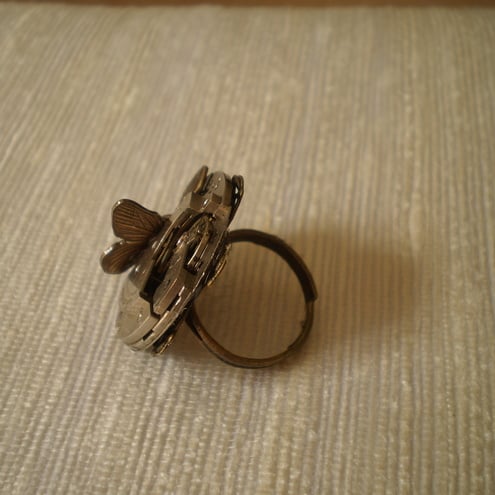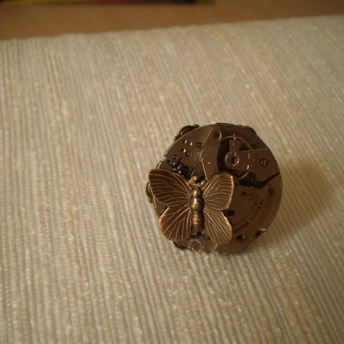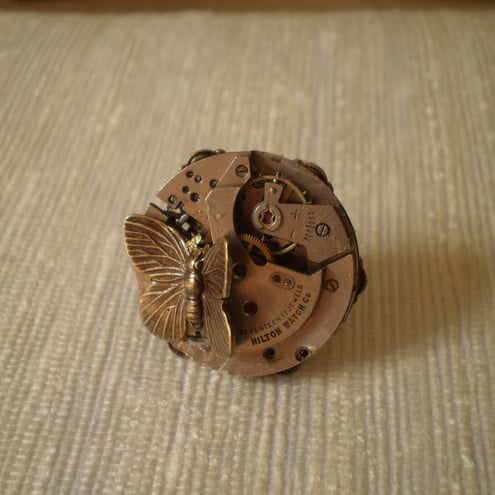 A whimsical Steampunk adjustable ring... a Vintage Hilton watch movement has a goldtone butterfly resting on it. Something unusual,.... but very wearable. Watch face is 2.5cms dia