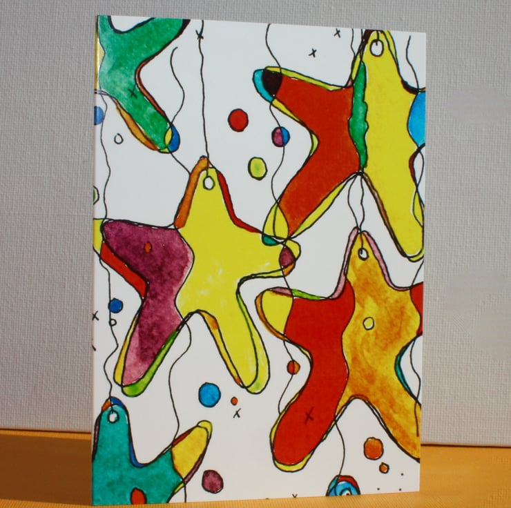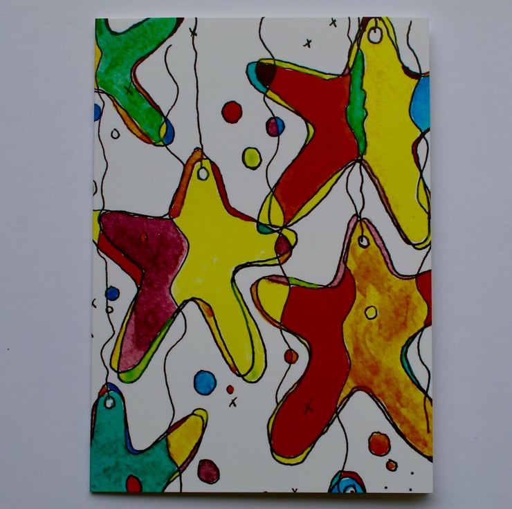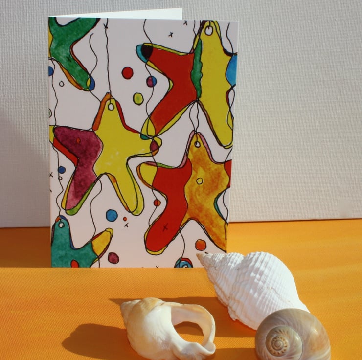 This A6 card which is printed on high quality recycled board would make a great card for people like me who would much rather be on the beach! The ink and watercolour sketch is a morph of starfish and hanging star decorations in jolly sunny colours. It comes supplied with a pristine white envelope and packed in a cello packet. Equally great for birthdays and other special occasions the card comes blank for your own message.