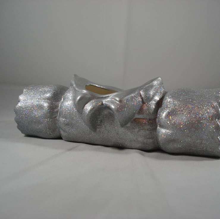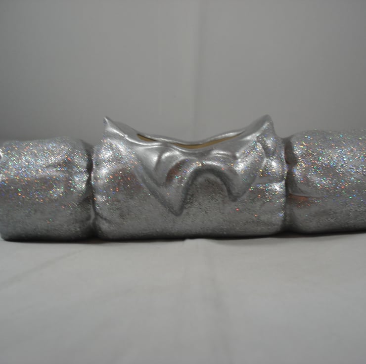 I have for sale a ceramic Christmas decoration, which was hand painted by myself. It is a silver, glittery Christmas cracker. This could be used as a candle/tealight holder, or perhaps fill it with a small gift or as a table centrepiece with holly. This would make a lovely addition to anyone's Christmas decorations, or perhaps as a gift.